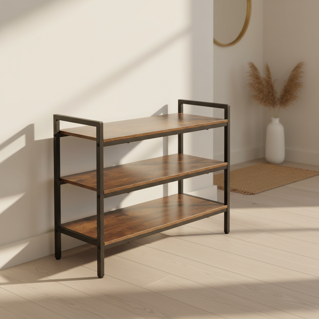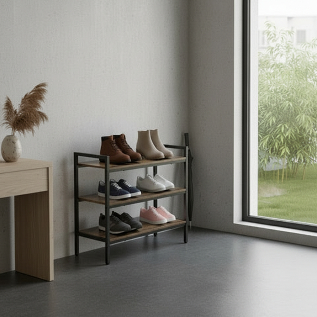 Pantofarul modern in stil industrial este alegerea perfecta pentru orice locuinta care are nevoie de ordine, functionalitate si un plus de design loft fara a ocupa mult spatiu. Cele trei rafturi solide sustin cu usurinta incaltamintea intregii familii, iar combinatia dintre cadrul metalic negru si rafturile MDF in nuanta maro cald transforma holul intr-un spatiu primitor si elegant. Este o piesa de mobilier compacta, durabila si gandita pentru utilizare de zi cu zi, ideala atat pentru apartamente mici, cat si pentru locuinte mai spatioase.