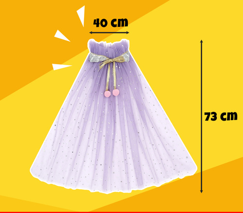Costumul este confectionat din poliester moale, plastic si fibre de polipropilena, materiale sigure si confortabile care nu irita pielea si permit libertate deplina de miscare. Fustita din tul are o lungime de 20 cm si confera un aspect pufos, delicat si elegant, in timp ce pelerina neagra completeaza perfect tinuta.