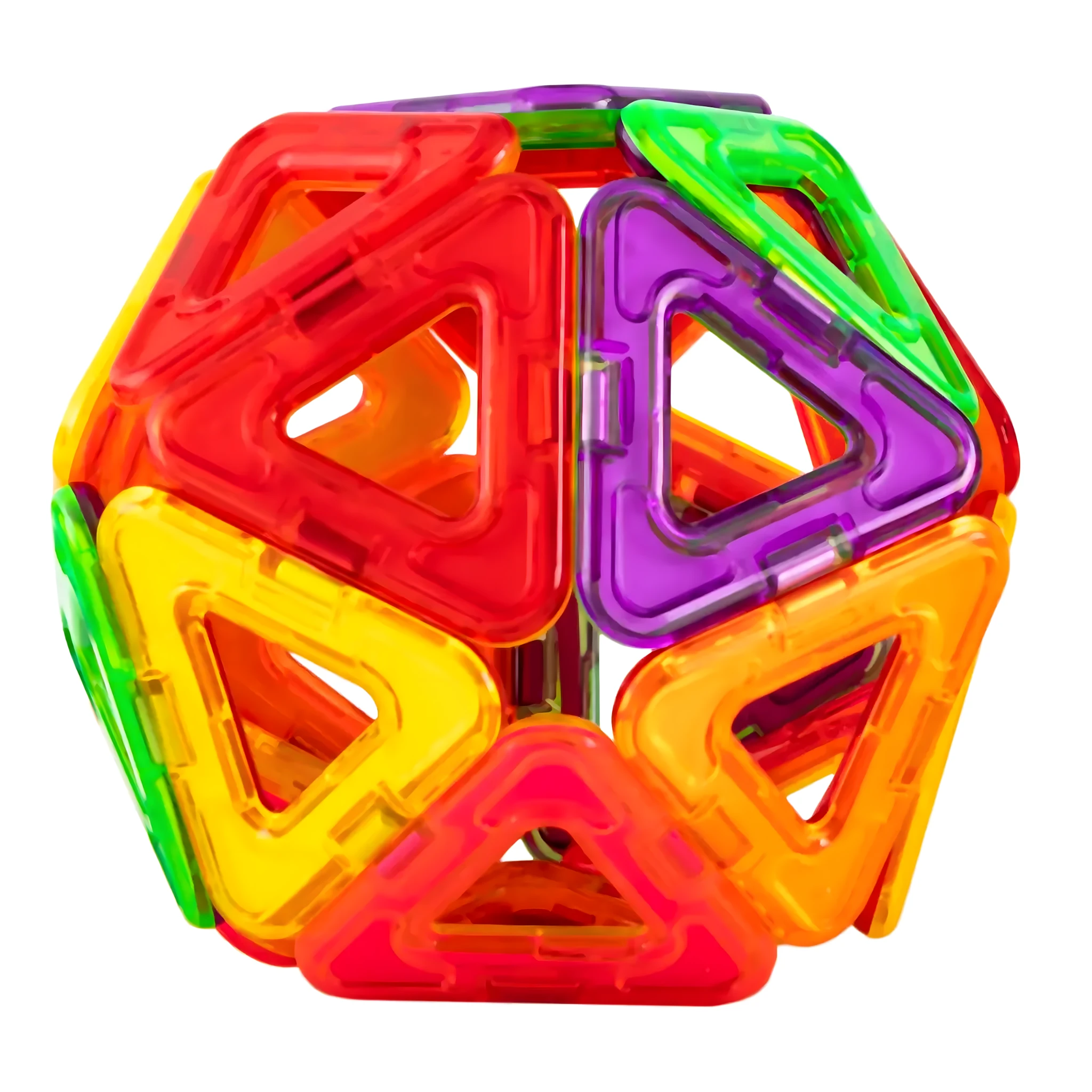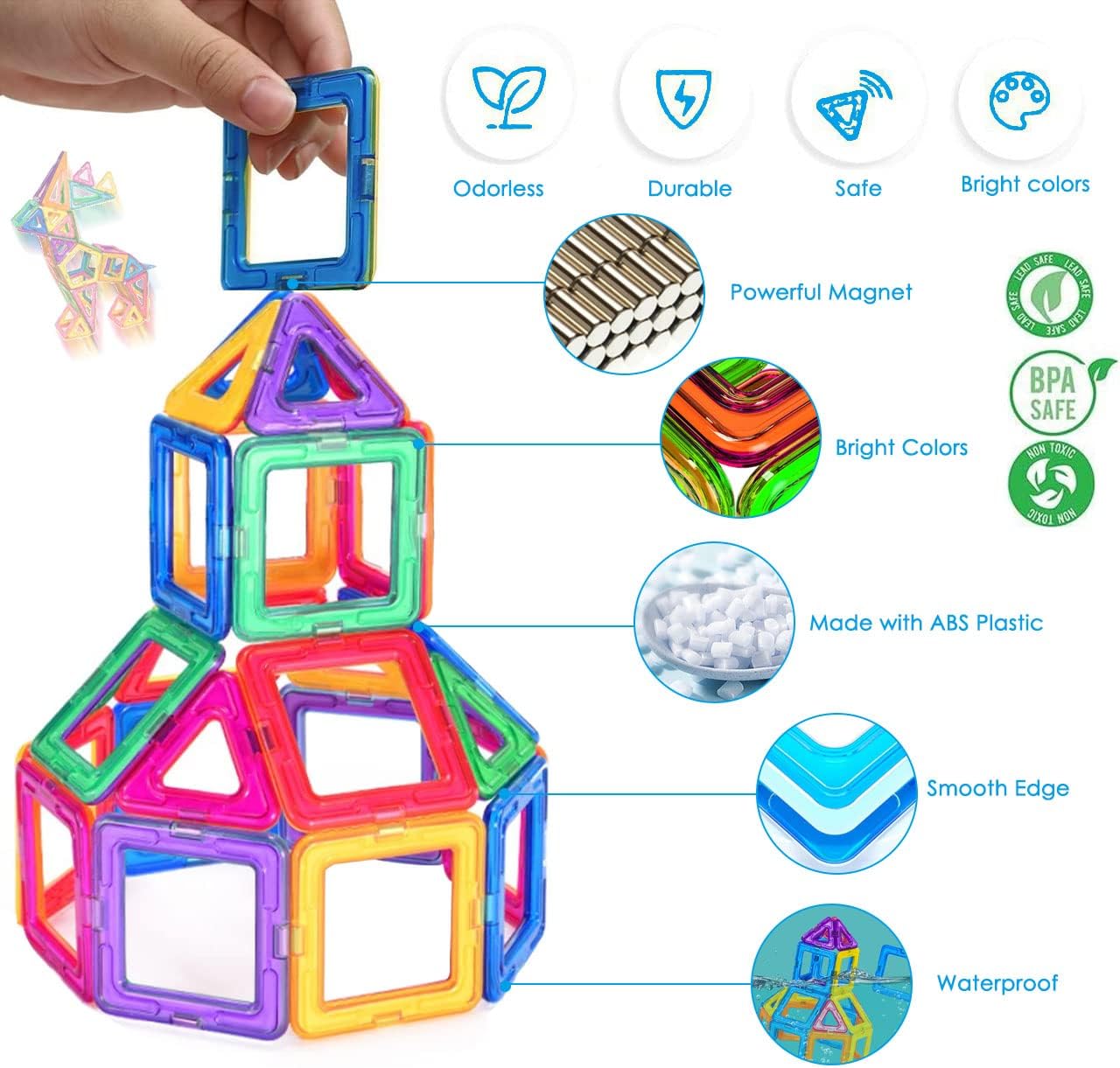 Setul contine 38 de piese magnetice – 14 patrate si 24 triunghiuri – realizate din plastic netoxic, durabil si sigur pentru copii, fiecare avand margini rotunjite pentru protectie sporita. Magneții puternici asigura o fixare stabila si usoara intre piese, permitand construirea unor structuri complexe precum castele, vehicule, roboti sau forme geometrice 3D.