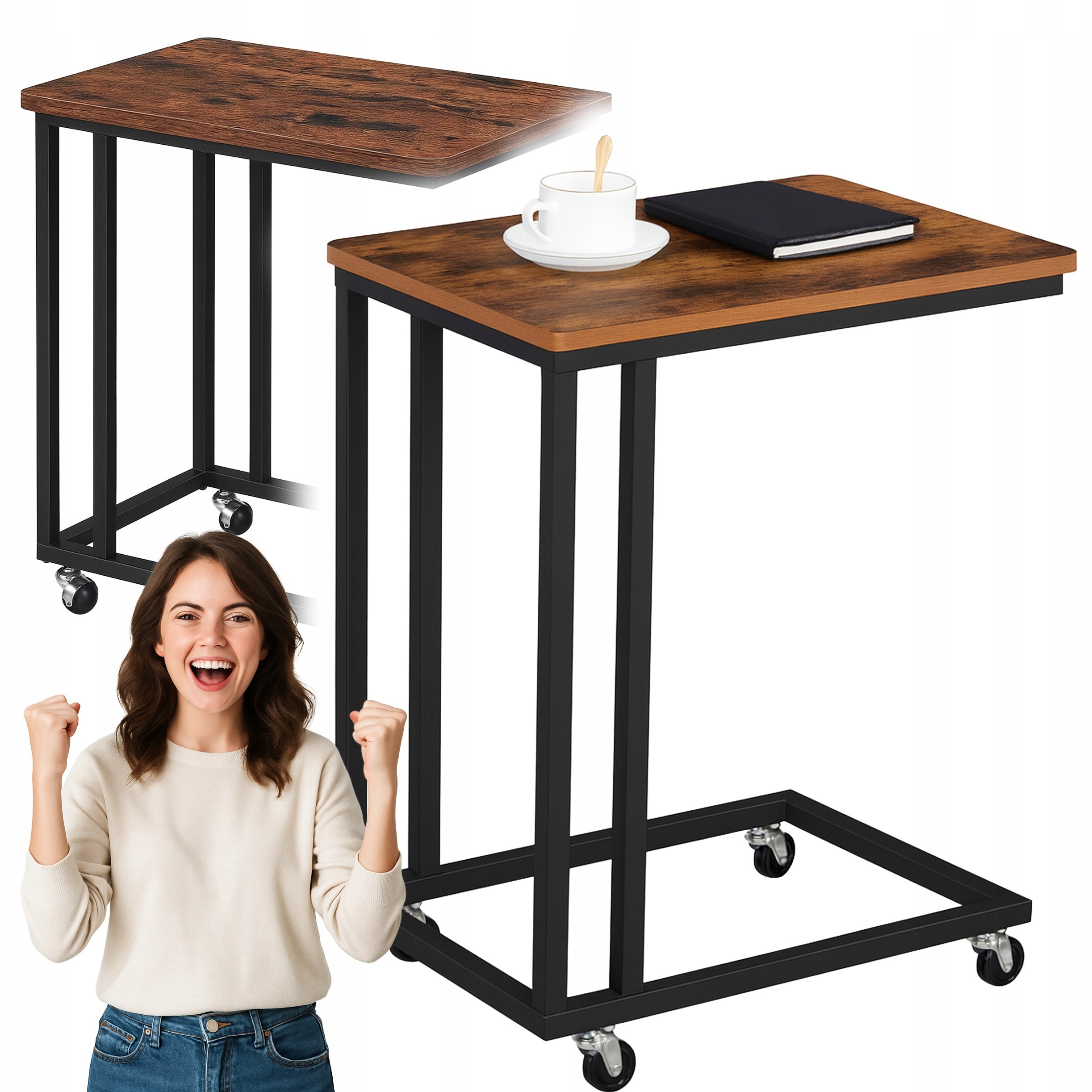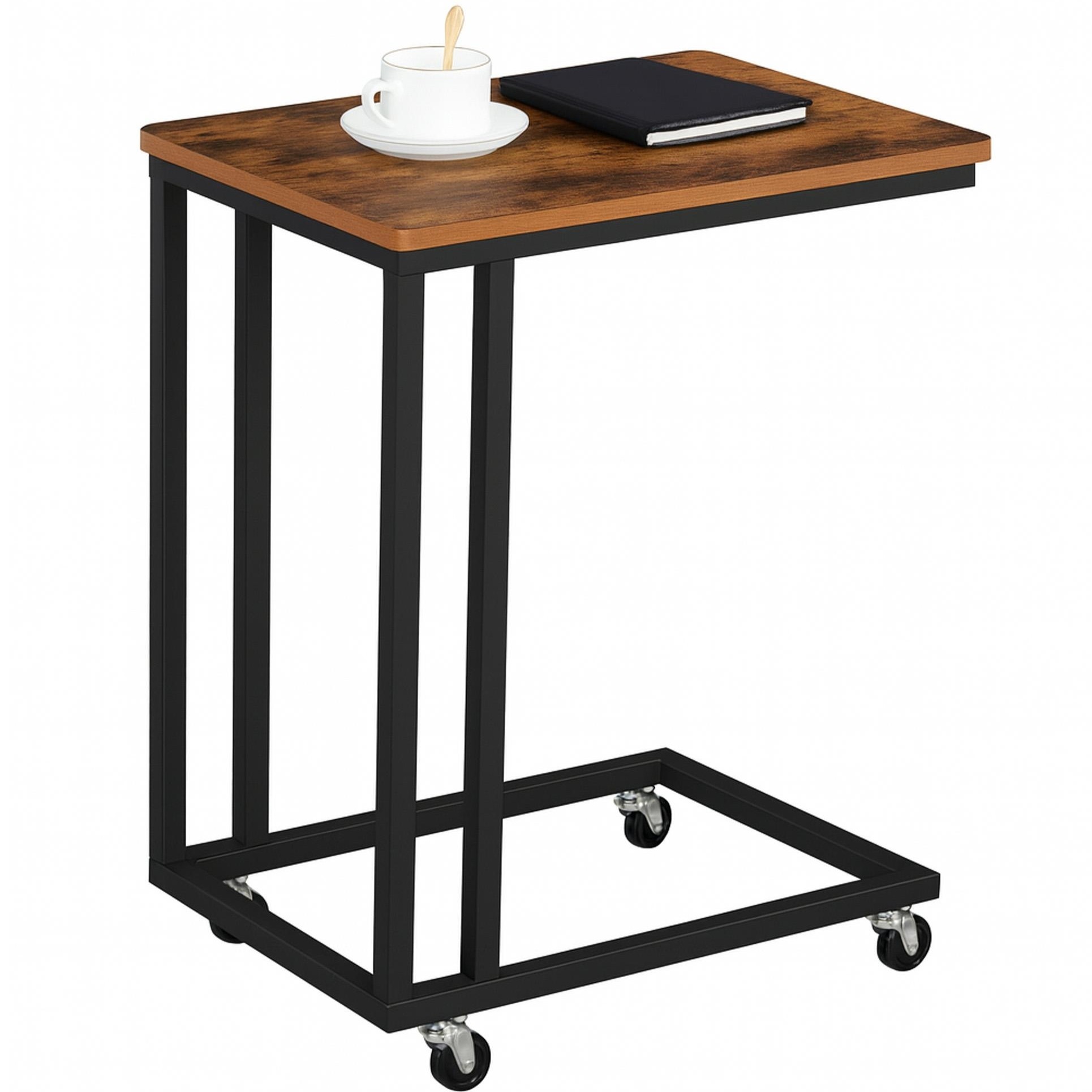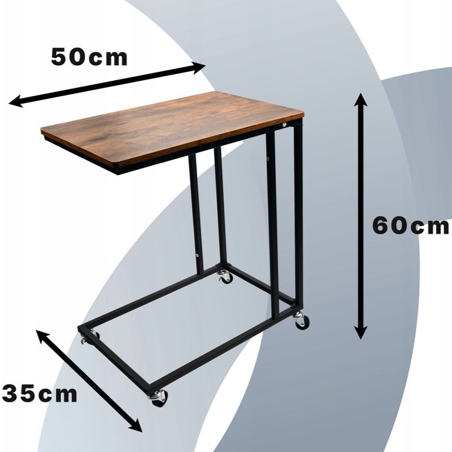 Masuta laterala de cafea cu roti este o piesa de mobilier practica si versatila, ideala pentru living, dormitor sau birou. Designul vintage cu blat in nuanta stejar fumuriu si cadru metalic negru ofera un aspect elegant, dar si stabilitate excelenta. Datorita formei ergonomice, masuta poate fi glisata usor sub canapea sau pat, oferind un spatiu confortabil pentru laptop, cafea sau carte.