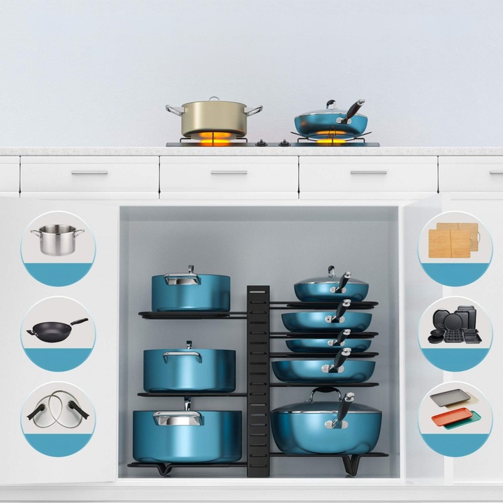 Beneficiile principale ale acestui organizator sunt legate de functionalitate, durabilitate si economie de spatiu. Functia esentiala este organizarea eficienta a tigailor, oalelor si capacelor pe 8 niveluri, fara a le suprapune, ceea ce reduce riscul de deteriorare a stratului antiaderent. Constructia metalica rezistenta asigura stabilitate si o utilizare indelungata, chiar si in cazul vaselor mai grele. Distanta reglabila intre rafturi, ajustabila la fiecare 2 cm, permite adaptarea in functie de dimensiunea vaselor, fie ca este vorba de tigai subtiri, capace sau oale mai voluminoase. Posibilitatea de utilizare verticala sau orizontala face ca produsul sa fie ideal pentru dulapuri de bucatarie, blaturi, camara sau spatii dificile precum zona de sub chiuveta. Avantajul major pentru client este economia de spatiu, ordine constanta si acces rapid la vasele folosite zilnic, fara zgomot sau manevre incomode.
