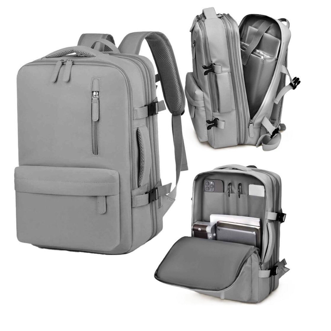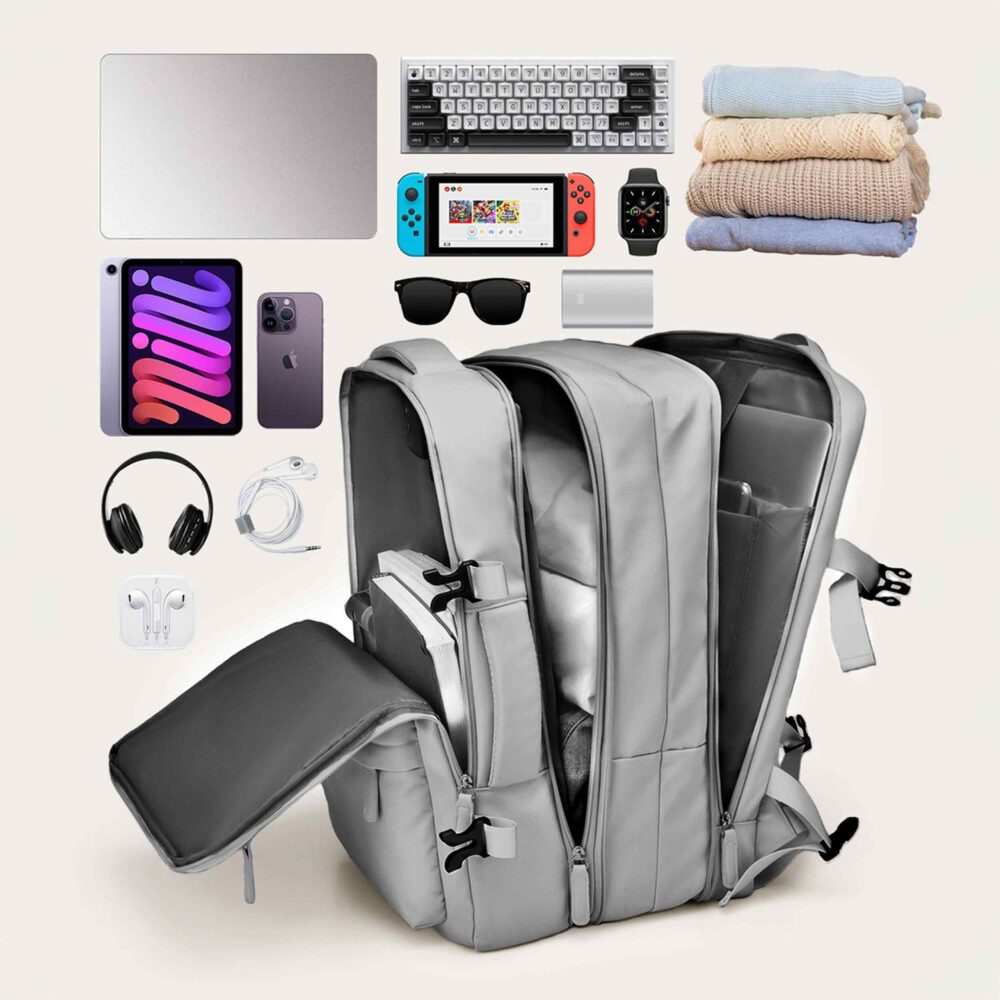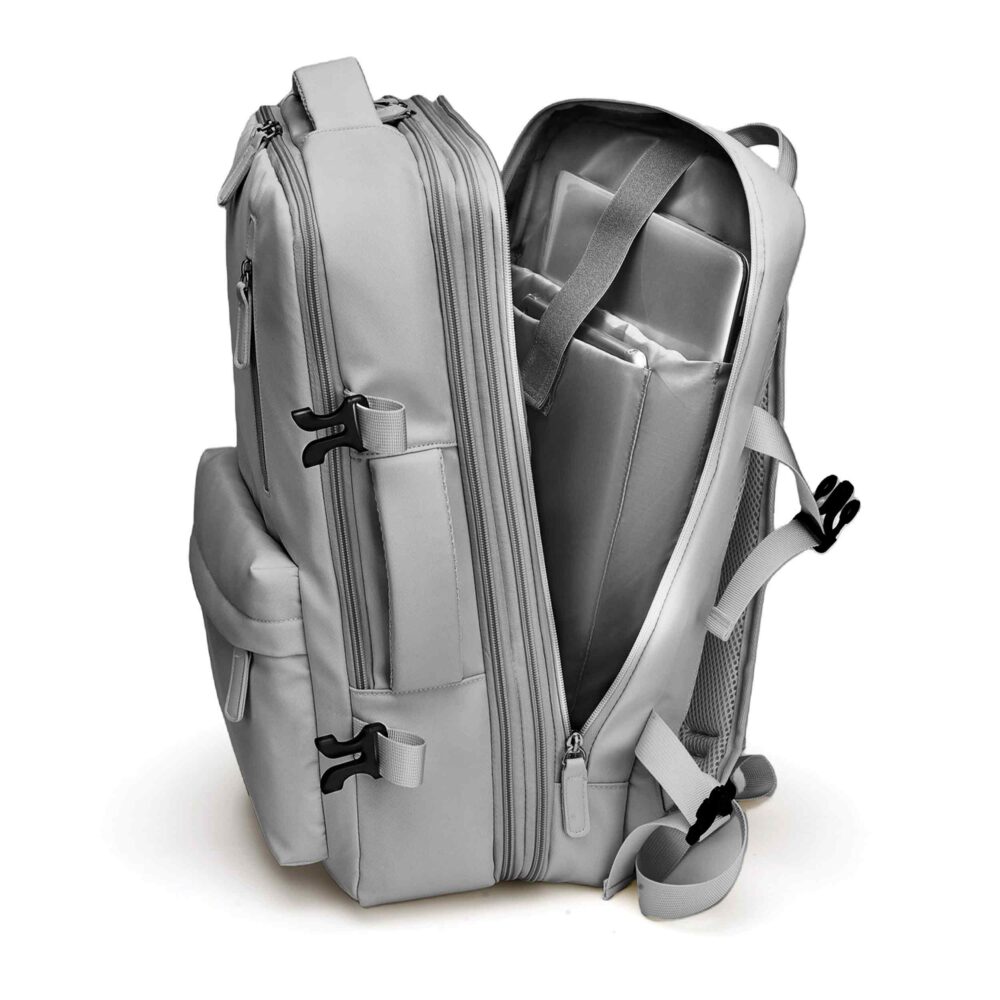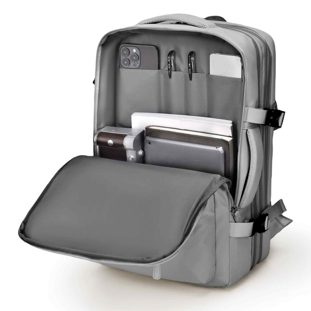 Rucsac calatorie avion, Zola, 40 x 30 x 20-30 cm, 3 compartimente, buzunare multiple, sistem agatare pe troler, impermeabil, poliester, gri