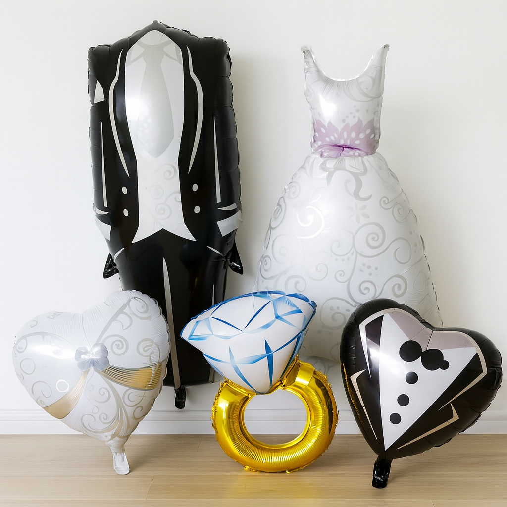 Setul contine rochie de mireasa, costum, doua inimioare si un inel de logodna, fiecare balon avand un design distinct, menit sa evidentieze simbolurile iubirii si ale casatoriei. Aceste elemente se completeaza perfect si creeaza o atmosfera rafinata si romantica, ideala pentru a impresiona invitatii si pentru a ramane in amintiri pretioase.