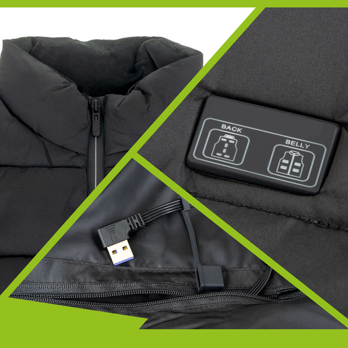 Alimentare prin USB – portul USB ascuns in buzunarul interior permite conectarea unei baterii externe (power bank, neinclusa), oferind mobilitate completa si posibilitatea de a fi incarcata oriunde.