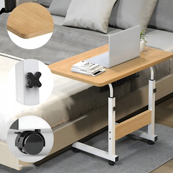 Birou mobil pentru laptop, Zola, 60 x 40 x 69-90 cm, inaltime reglabila, roti pivotante, mecanism blocare, cadru metalic, PAL, alb/artar