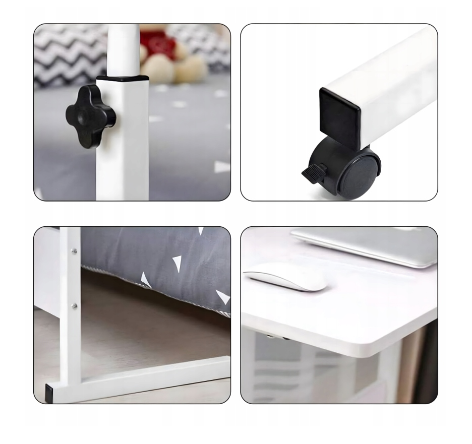 Mobilitatea este unul dintre punctele sale forte: biroul dispune de 4 roti pivotante, dintre care 2 cu sistem de blocare, asigurand o deplasare usoara si o stabilitate excelenta in timpul utilizarii. Astfel, il poti muta fara efort dintr-o incapere in alta – din dormitor in living, din birou in terasa – pastrandu-ti mereu confortul dorit.