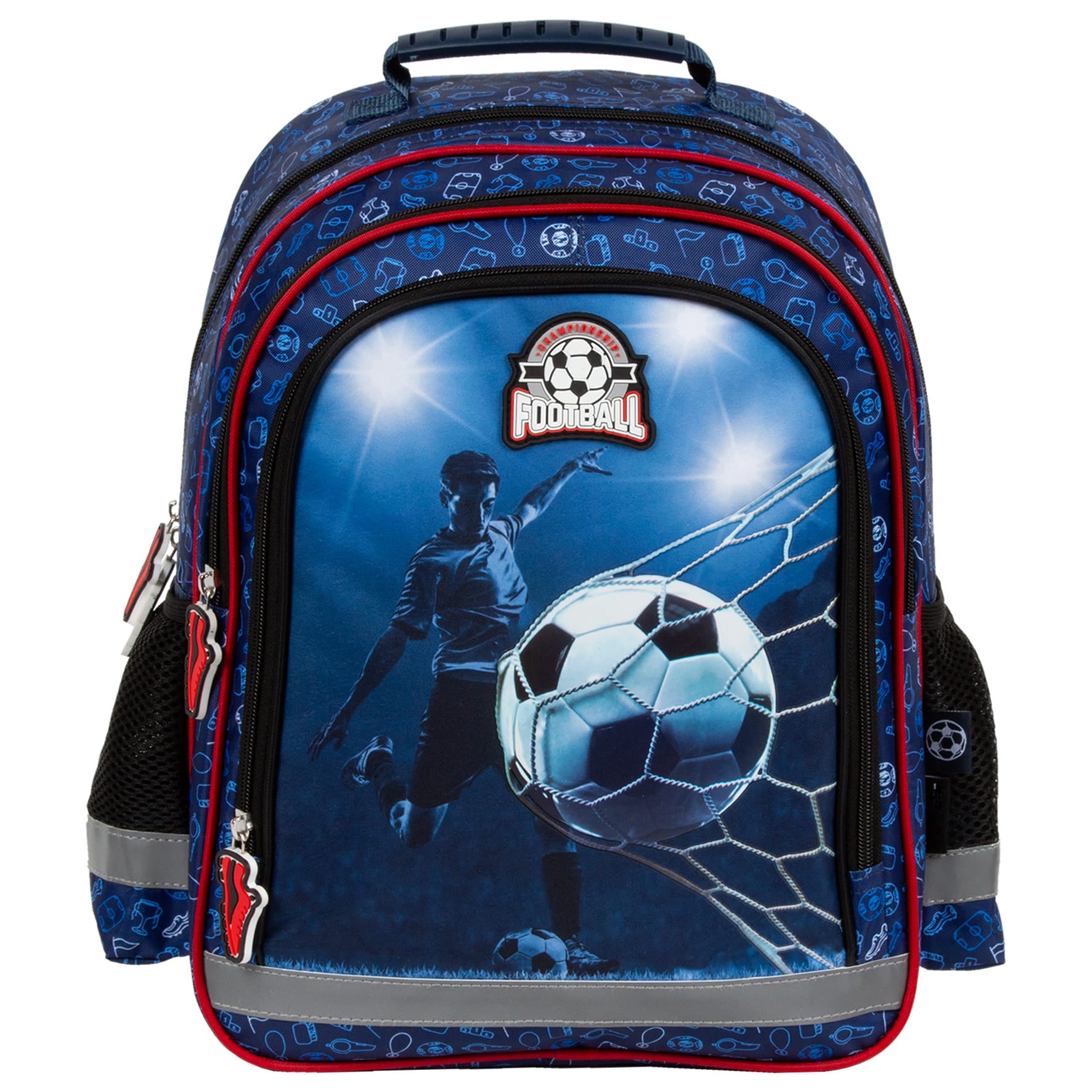 Ghiozdan ergonomic clasa pregatitoare, Zola, 3 compartiment, 2 buzunare laterale din plasa, bretele reglabile, spate cu spuma, greutate redusa, albastru cu fotbal, 38 x 28 x 18 cm
