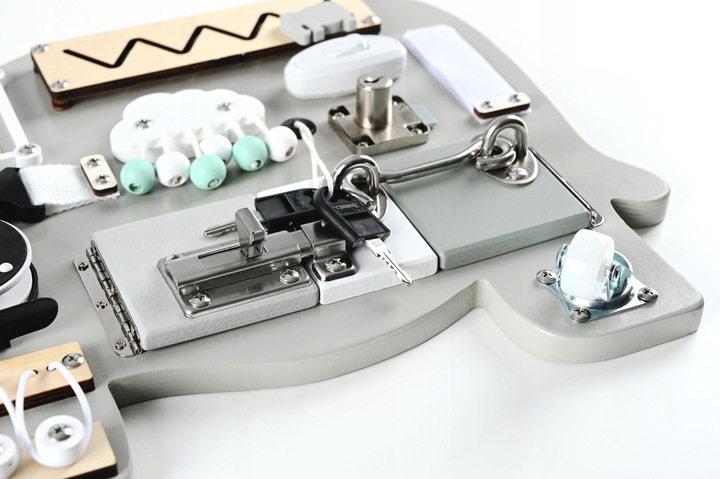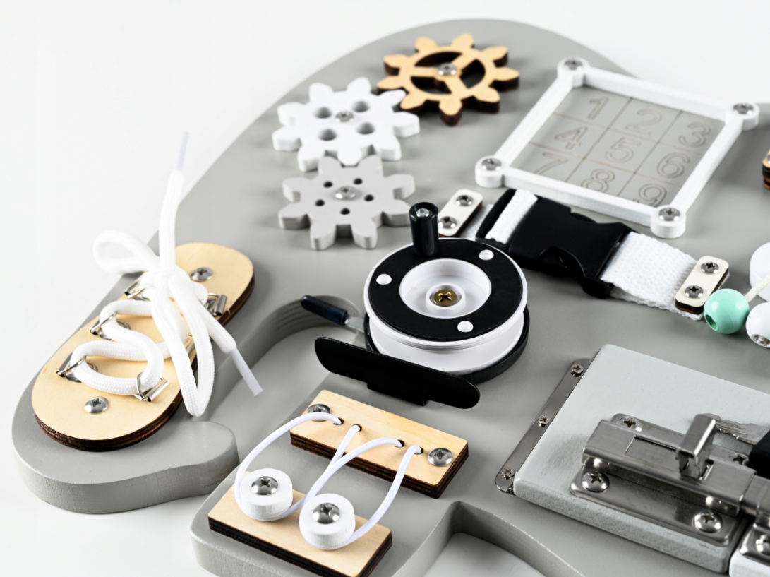 Copilul poate explora liber fiecare mecanism – poate roti angrenajele, trage de sireturi, apasa butoanele sau incerca sa descuie zavoarele. Prin repetitie, isi imbunatateste dexteritatea, gandirea analitica si capacitatea de observare. Placa poate fi asezata pe podea, pe o masa sau sprijinita pe perete, oferind o pozitie confortabila de joaca.