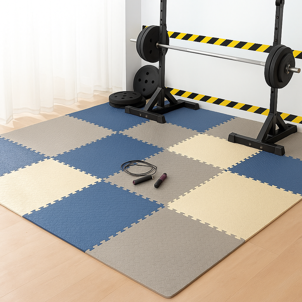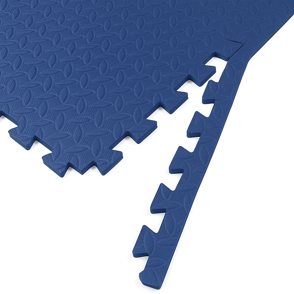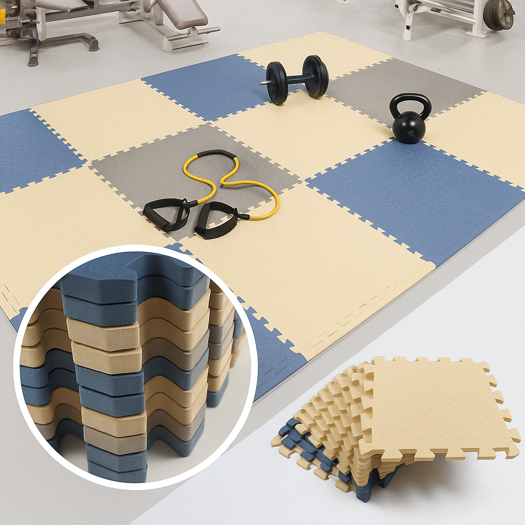 Fabricat din spuma EVA rezistenta, covorul atenueaza socurile, reduce zgomotul si asigura o aderenta sporita, fiind potrivit pentru antrenamente fitness, yoga, aparate sportive, sala de acasa, zona pentru copii sau spatii recreative. Materialul nu absoarbe apa, se curata usor si mentine o suprafata stabila chiar si in timpul exercitiilor intense. Combinatia de culori bej/albastru ofera un aspect profesional si modern pentru orice incapere.