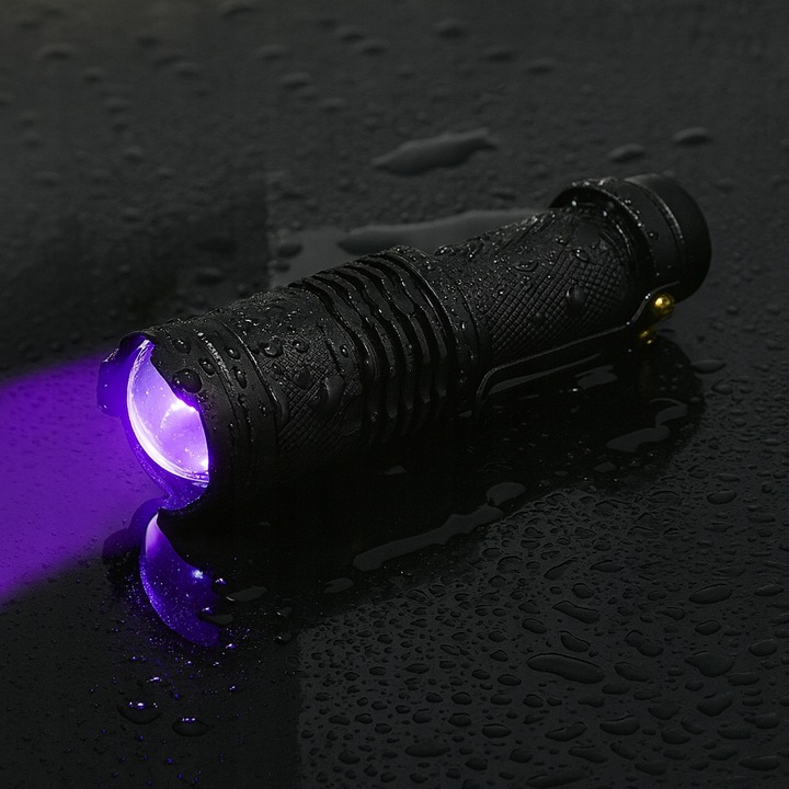 Lanterna tactica UV cu functie zoom,Zola, rezistenta la apa, IPX4, alimentare baterii, aliaj aluminiu, 9.2x2.5 cm, neagra