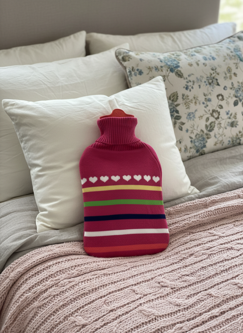 Aceasta perna pentru apa calda este accesoriul perfect pentru a aduce caldura, relaxare si alinare rapida in zilele reci sau in momentele in care simti nevoia de confort suplimentar. Fabricata din cauciuc rezistent, cu o capacitate generoasa de 2l, si decorata cu un model inimi si dungi extrem de atragator, este atat utila, cat si decorativa. Poate fi folosita de intreaga familie si este potrivita pentru multiple situatii – incalzirea patului, calmarea durerilor musculare, atenuarea crampelor, imbunatatirea circulatiei si multe altele.