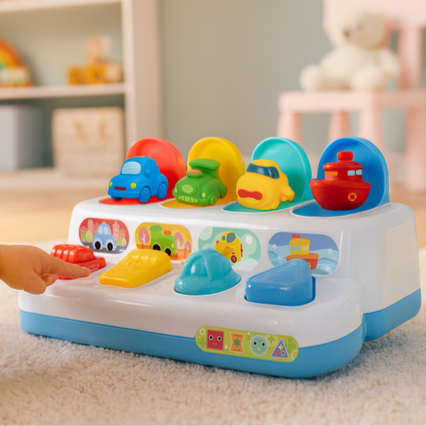 Aceasta jucarie interactiva este dotata cu patru vehicule pop-up care sar afara atunci cand copilul apasa butoanele sau comutatoarele corespunzatoare. Datorita designului compact (25 x 13 x 12 cm), poate fi folosita cu usurinta atat pe masa, cat si pe covor, iar greutatea redusa o face usor de transportat in calatorii sau vizite. Este un produs ideal pentru parinti care isi doresc o jucarie versatila, usor de depozitat si sigura pentru micutii lor.