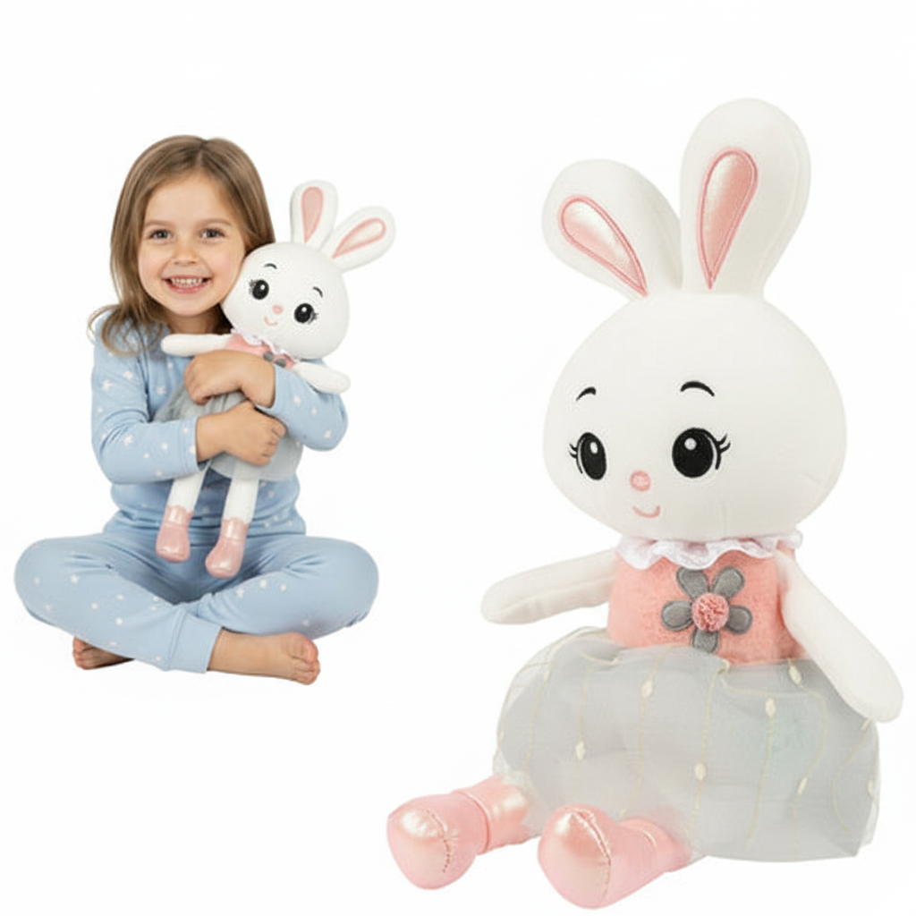 Un iepuras de plus moale, adorabil si reconfortant, creat special pentru a deveni prietena preferata a copilului tau. Cu o inaltime de 45 cm, rochita roz delicata si ghetute asortate, acest plus rafinat oferit de Zola este companionul perfect pentru somn, joaca, calatorii si momente de liniste. Materialul moale, catifelat si prietenos cu pielea transforma fiecare imbratisare intr-un moment de calm, afectiune si siguranta – exact ce isi doreste orice copil.