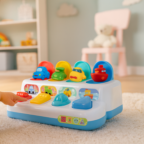 Aceasta jucarie interactiva este dotata cu patru vehicule pop-up care sar afara atunci cand copilul apasa butoanele sau comutatoarele corespunzatoare. Datorita designului compact (25 x 13 x 12 cm), poate fi folosita cu usurinta atat pe masa, cat si pe covor, iar greutatea redusa o face usor de transportat in calatorii sau vizite. Este un produs ideal pentru parinti care isi doresc o jucarie versatila, usor de depozitat si sigura pentru micutii lor.