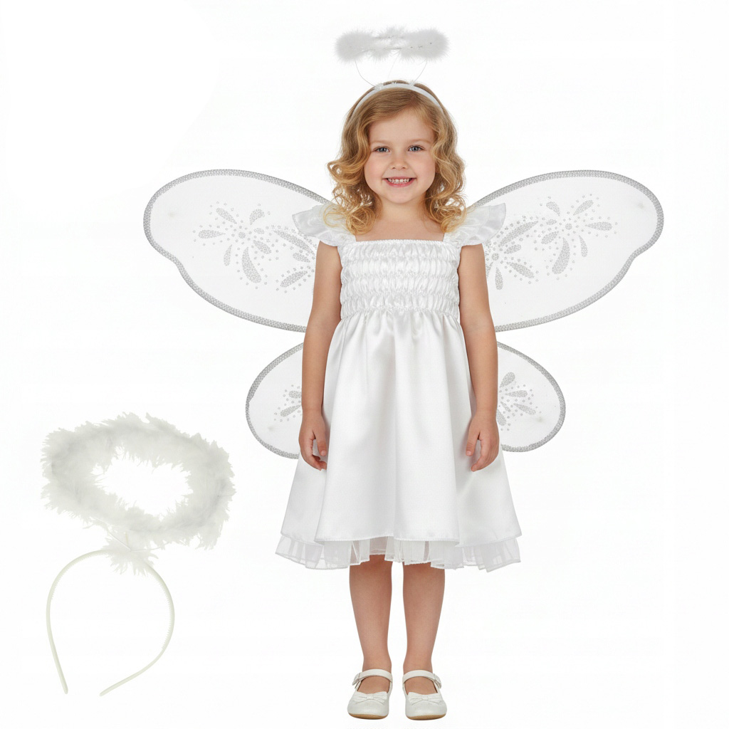 Costum inger pentru fetite 3 piese este alegerea ideala pentru serbari, carnaval, piese de teatru sau petreceri tematice. Setul complet format din rochie, aripi si coronita transforma instant orice aparitie intr-un moment special, oferind un look delicat, stralucitor si plin de farmec. Este perfect pentru serbari de Craciun, colinde, Halloween sau evenimente scolare unde copilul tau trebuie sa straluceasca pe scena.