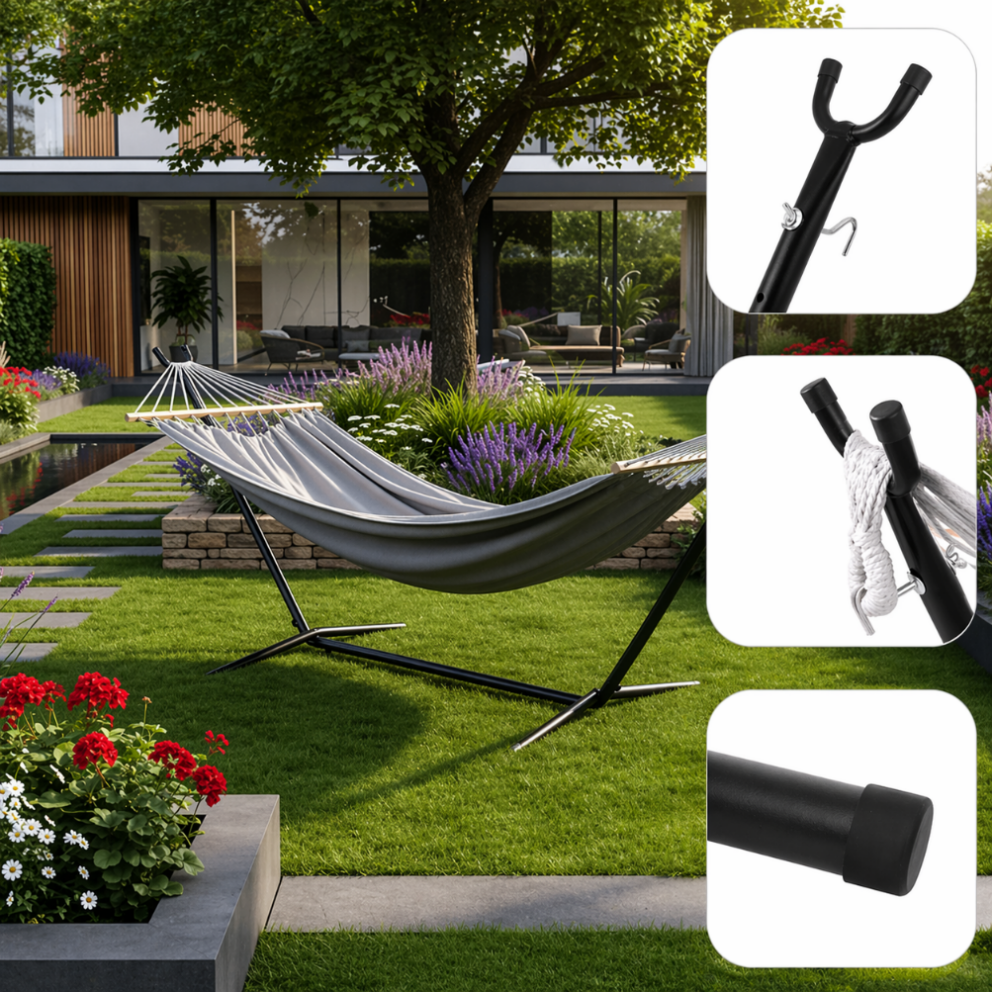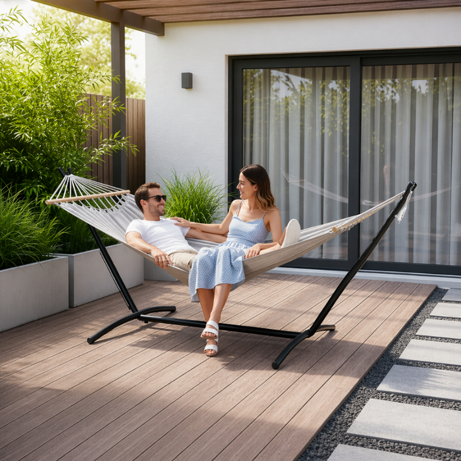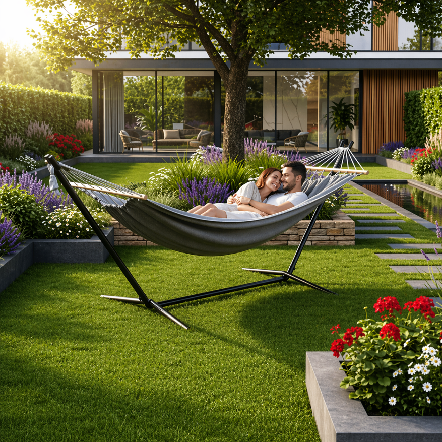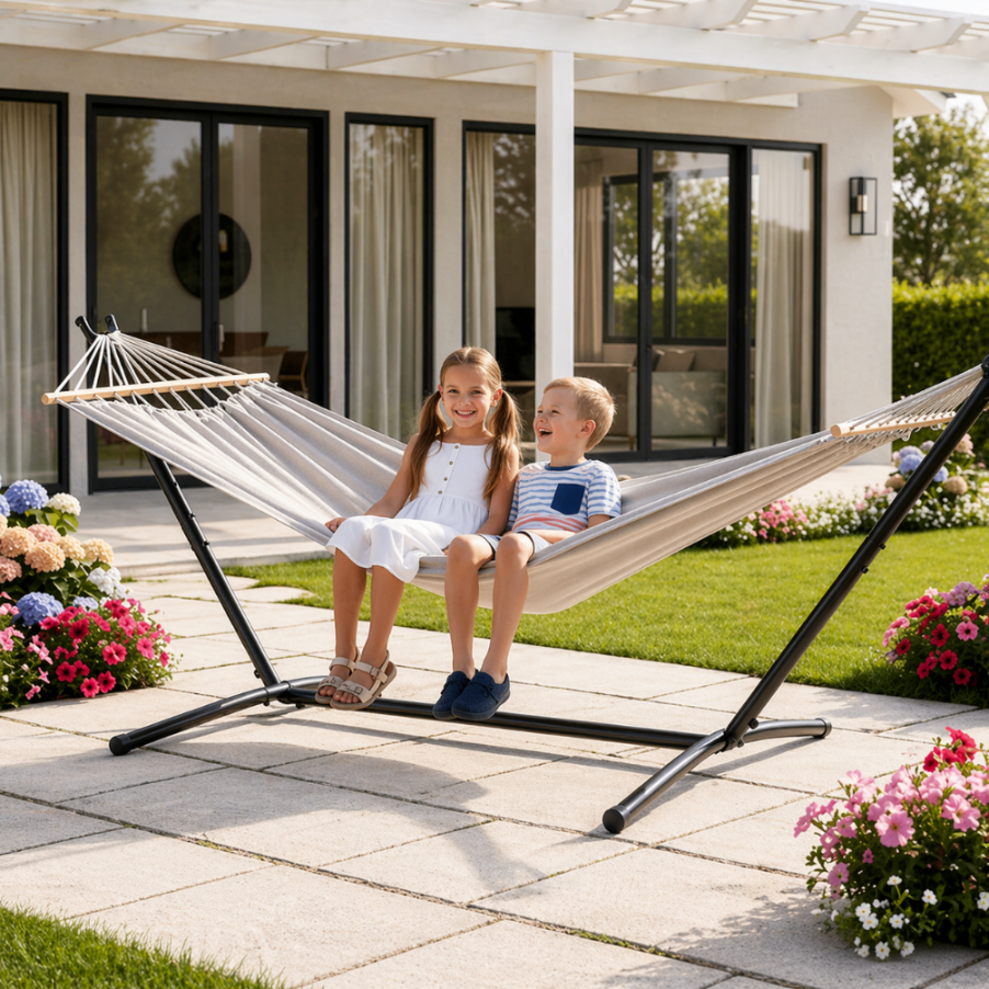 Hamacul de gradina dublu XXL cu suport metalic este o alegere practica pentru cei care isi doresc un loc confortabil de relaxare, cu montaj simplu, stabilitate buna si utilizare flexibila in orice spatiu exterior.