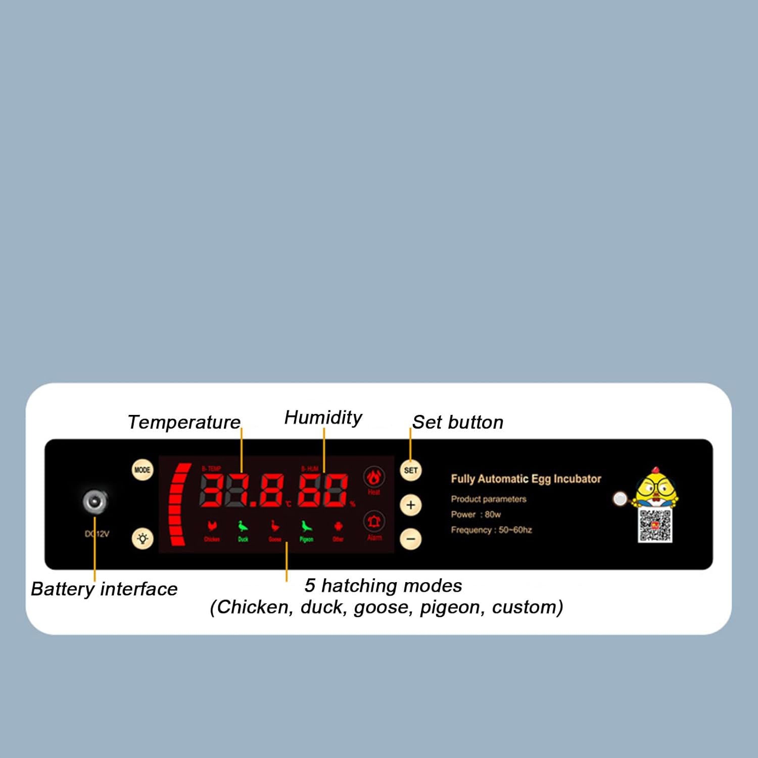 Incubatorul dispune de control automat al umiditatii si o alarma inteligenta, care avertizeaza in cazul unor diferente fata de parametrii optimi. Conectarea la surse de alimentare 230V sau 12V permite utilizarea atat in gospodarie, cat si in situatii de urgenta, cand reteaua electrica nu este disponibila.