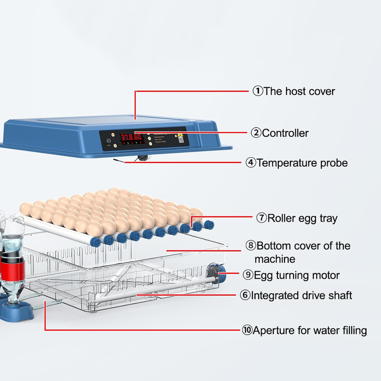 Incubator automat 64 de oua, Zola, 80 W, rotire automata, control umiditate, temperatura 15-30 °C, afisaj LED, cablu inclus, 21 × 49 × 45.5 cm, albastru