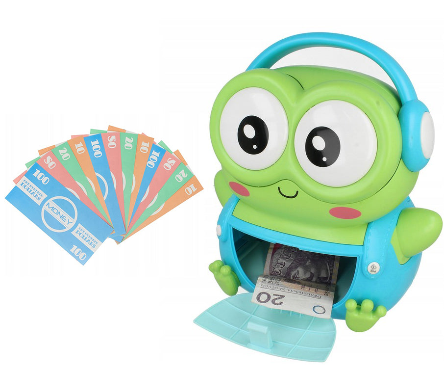 Mecanism Automat pentru Bancnote: Mecanismul automat care trage bancnotele in interiorul broastei este o caracteristica interesanta si interactiva. Acesta face procesul de economisire mai atractiv pentru copii si ii invata sa foloseasca tehnologia intr-un mod distractiv.