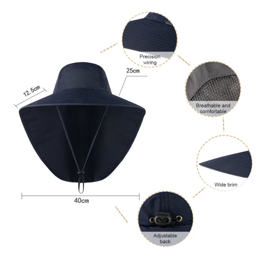 Protectie completa impotriva soarelui in cele mai fierbinti zile de vara! Aceasta palarie de soare cu clapeta pentru gat este un accesoriu indispensabil pentru oricine petrece timp in aer liber, fie ca este vorba de pescuit, plaja sau drumetii . Cu un design gandit special pentru a oferi protectie maxima impotriva razelor UV , palaria este atat functionala , cat si confortabila , adaptata nevoilor celor activi si mereu in miscare.
