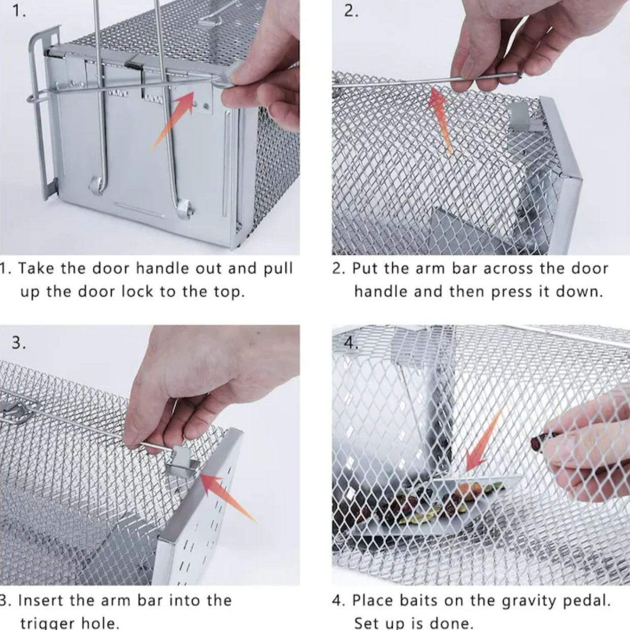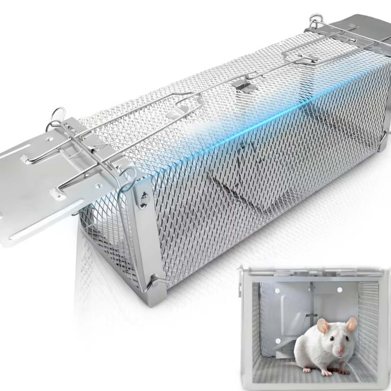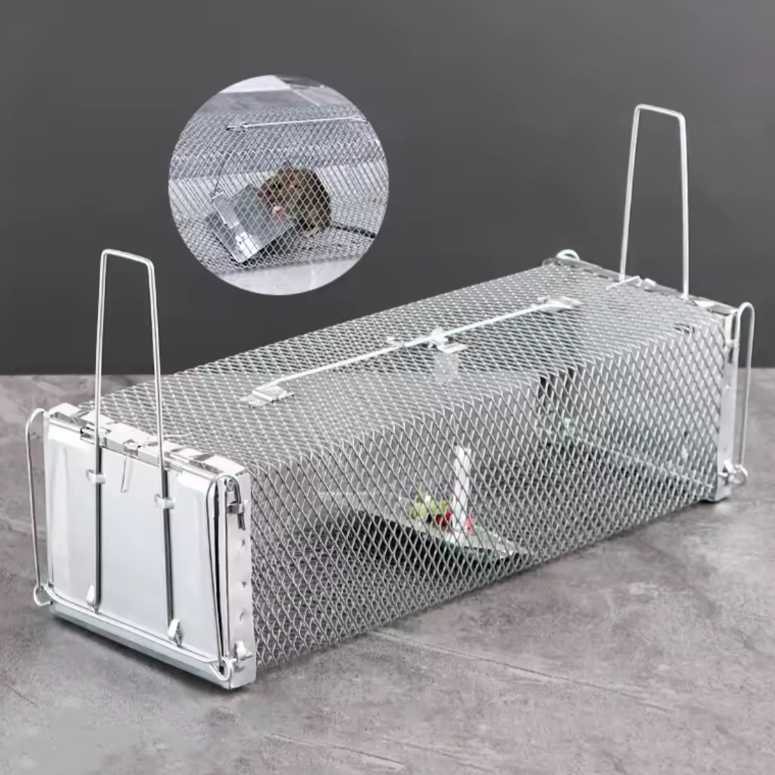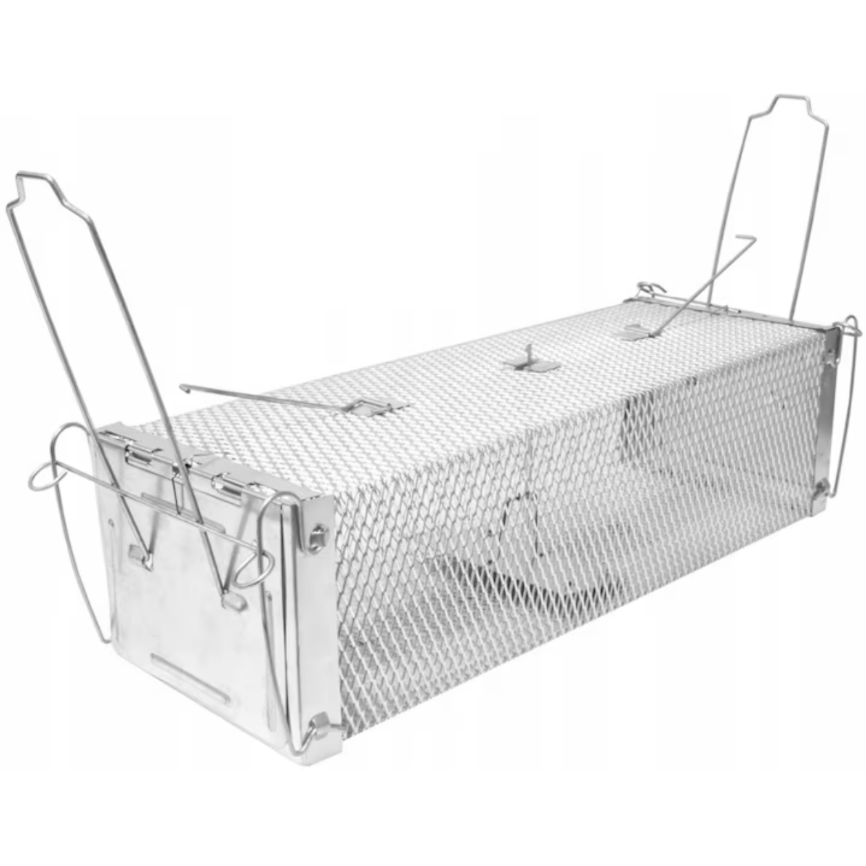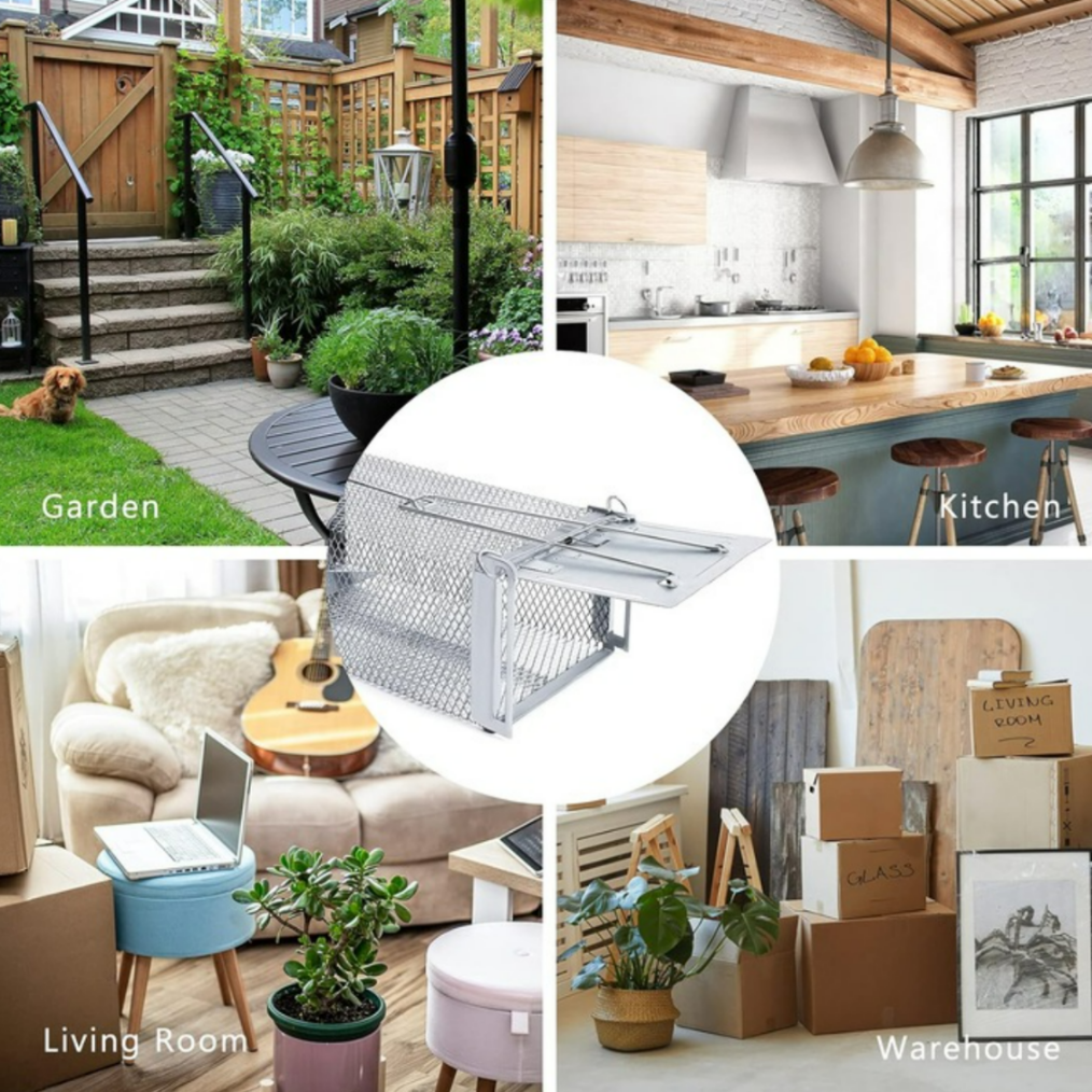 Construita din metal rezistent si prevazuta cu plasa durabila, capcana este conceputa pentru a face fata rozatoarelor puternice, rezistand la roadere si tentative de evadare. Mecanismul simplu si eficient permite declansarea automata in momentul in care animalul intra in interior pentru a ajunge la momeala. Odata activata, clapeta se inchide rapid, iar rozatorul nu mai poate iesi singur.
