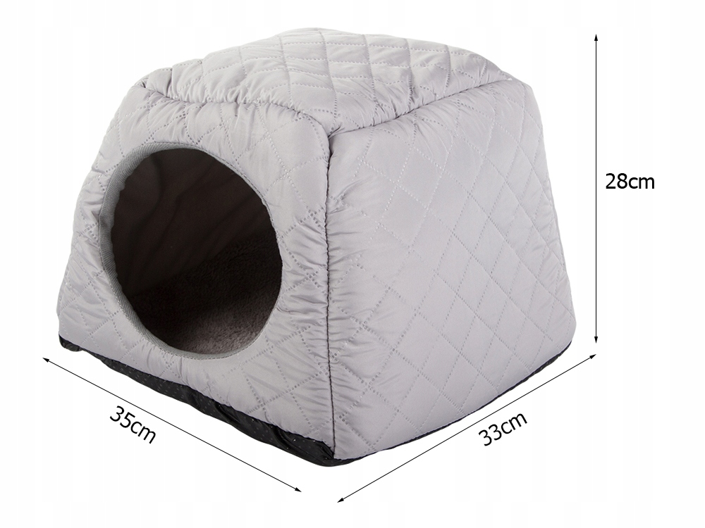 Cu dimensiunile de 28 x 35 x 33 cm, casuta este potrivita atat pentru pisici, cat si pentru caini de talie mica, oferindu-le suficient spatiu pentru a se intinde, a dormi sau a se relaxa confortabil.