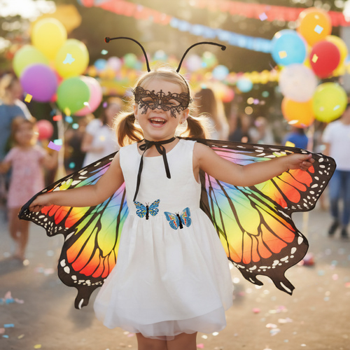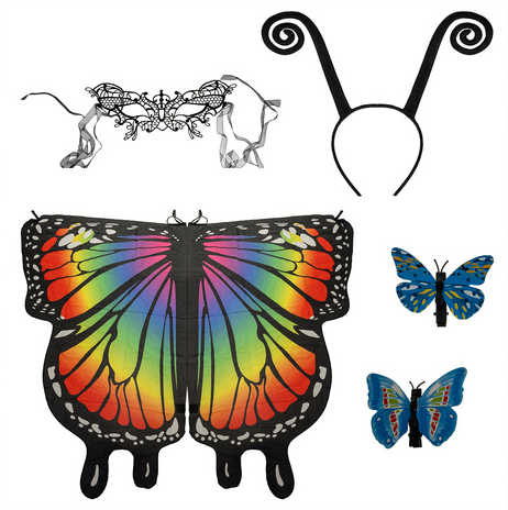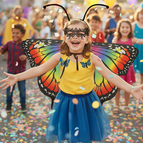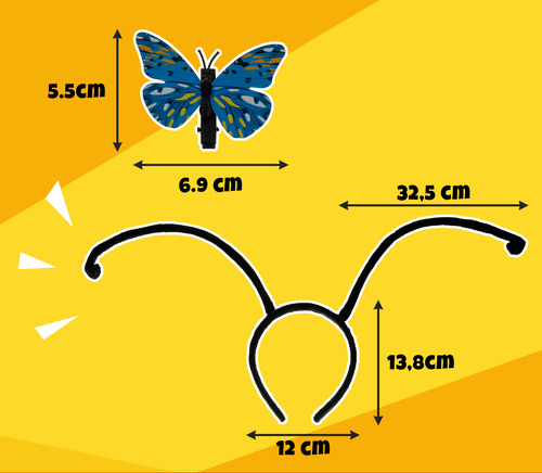 Costumul este compus din 5 elemente atent realizate: aripi spectaculoase din tul stralucitor cu steluțe aurii, o masca eleganta pentru ochi, o banda cu antene delicate si 2 agrafe de par, completand perfect look-ul de fluture magic. Materialele usoare si flexibile din poliester, fibra sintetica, sarma de fier si rasina ofera confort si libertate de miscare, astfel incat copilul se poate bucura de ore intregi de distractie fara disconfort.