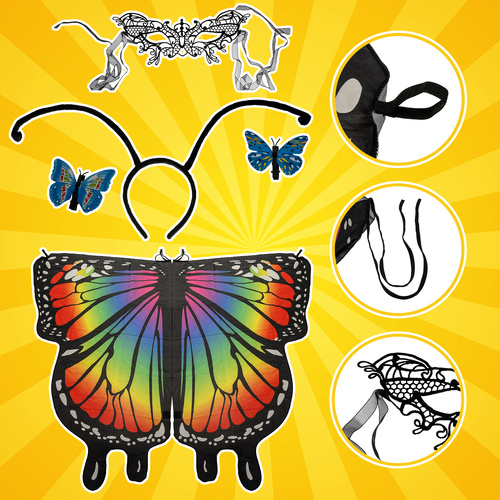 Costum de fluture 3 piese, Zola, aripi 134 x 110 cm, coronita, masca, 2 agrafe, multicolor