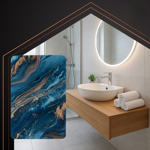 Design elegant si modern – model abstract turcoaz/auriu ce completeaza perfect decorul baii.