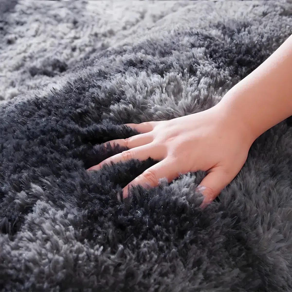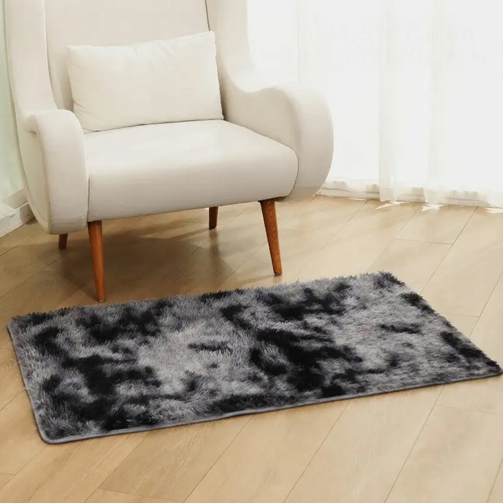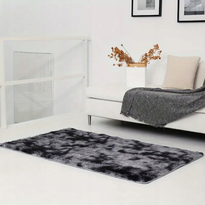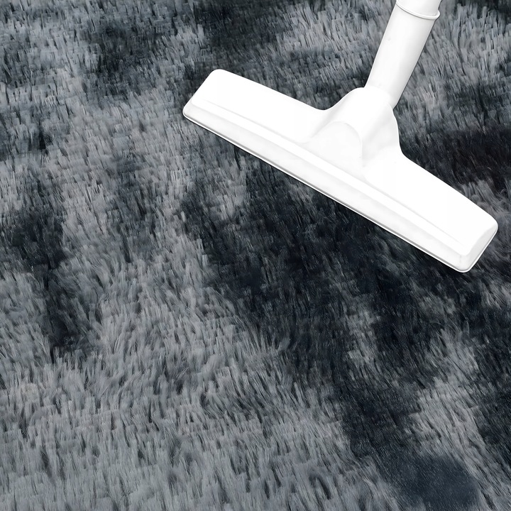Covorul este realizat din poliester de calitate superioara, ceea ce il face rezistent, usor de intretinut si sigur pentru copii si animale de companie. Firele dese si pufoase creeaza un efect vizual spectaculos, reflectand lumina si dand impresia de profunzime si lux.