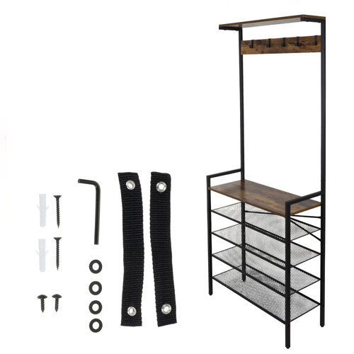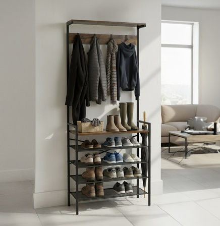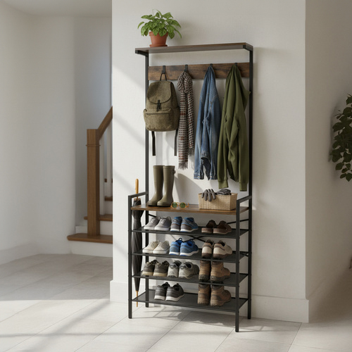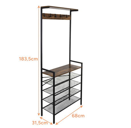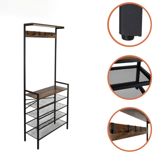 Cuier pentru hol stil industrial, Zola, 5 agatatori, 4 rafturi incaltaminte, 2 polite, 183.5 x 31.5 x 68 cm, cadru metalic, MDF, negru/maro