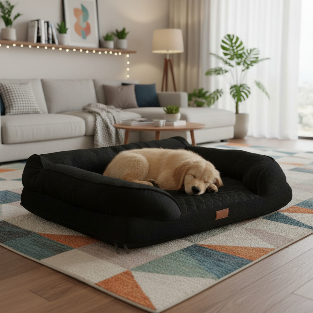 • Spuma ortopedica care distribuie uniform greutatea si sustine coloana si articulatiile, ideala pentru caini tineri, adulti sau seniori.