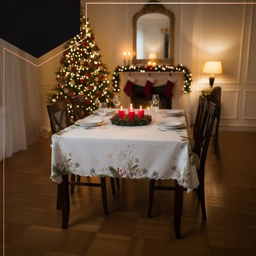 Aceasta fata de masa nu este doar functionala, ci si decorativa – imprimeul subtil de Craciun adauga un farmec aparte, creand atmosfera calda si magica specifica sarbatorilor. Albul elegant aduce luminozitate si rafinament, punand in valoare ornamentele si accesoriile de masa.