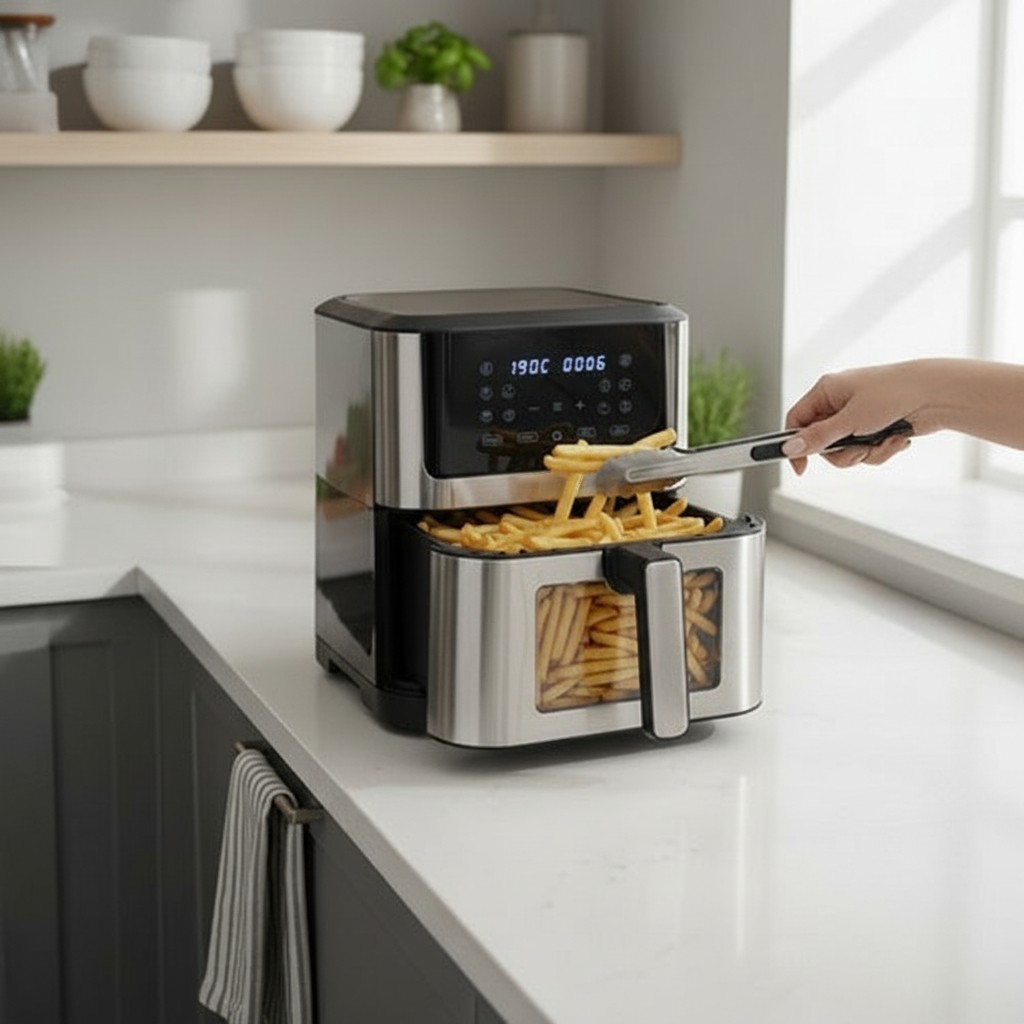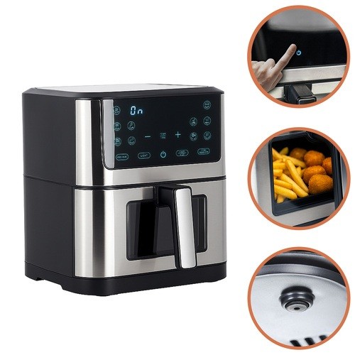 Friteuza cu aer cald de 8 litri este alegerea ideală daca vrei sa gatesti mai sanatos, mai rapid si mai eficient, fara ulei, fara mirosuri neplacute si fara efort. Capacitatea XXL o face perfecta pentru familii numeroase, iar tehnologia de circulatie a aerului cald asigura o crusta crocanta la exterior si o textura frageda la interior, pentru cartofi prajiti, carne, legume si multe alte preparate. Designul modern, panoul tactil LED si fereastra de previzualizare transforma fiecare sesiune de gatit intr-o experienta usoara si placuta.