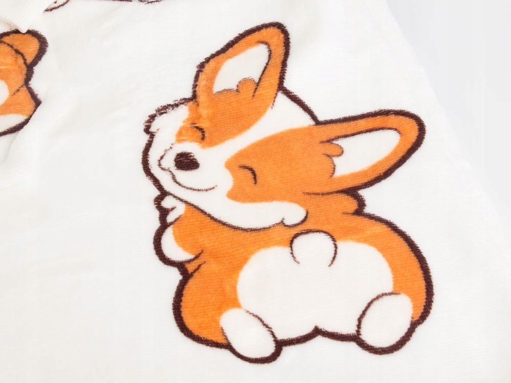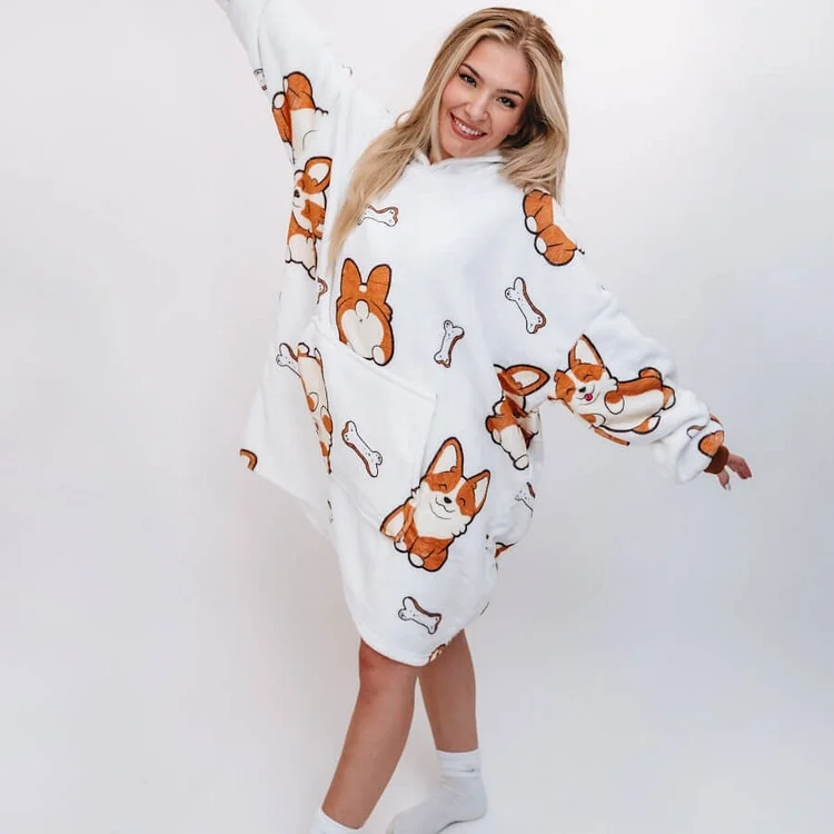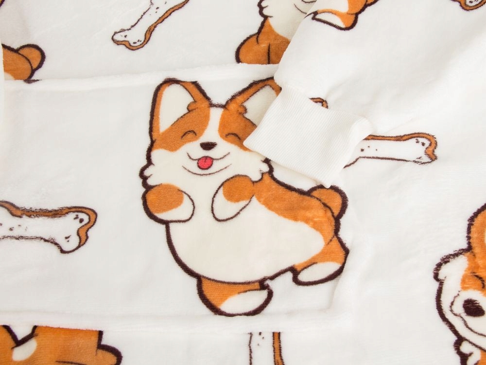 Hanorac patura 2 in 1 cu gluga si buzunar, Zola, caini corgi, marime universala, pufos, 80x80 cm
