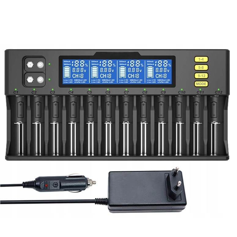 Incarcator baterii universal, Zola, 12 sloturi, pentru AA / AAA / 9V, afisaj LCD, negru