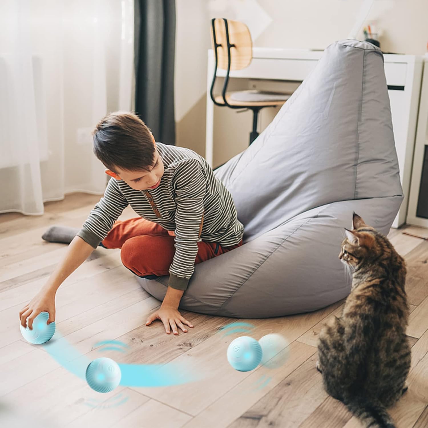 Mingea se misca autonom, creand un efect imprevizibil care mentine interesul pisicii.
