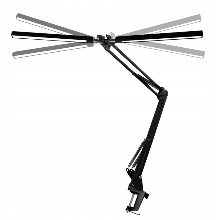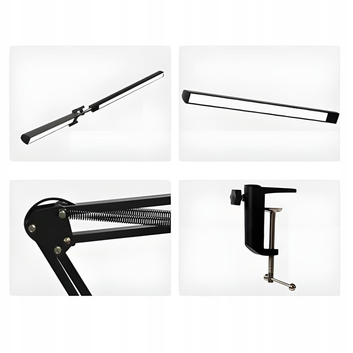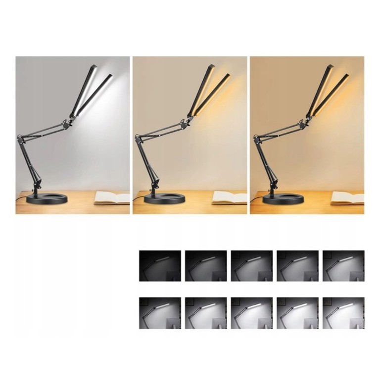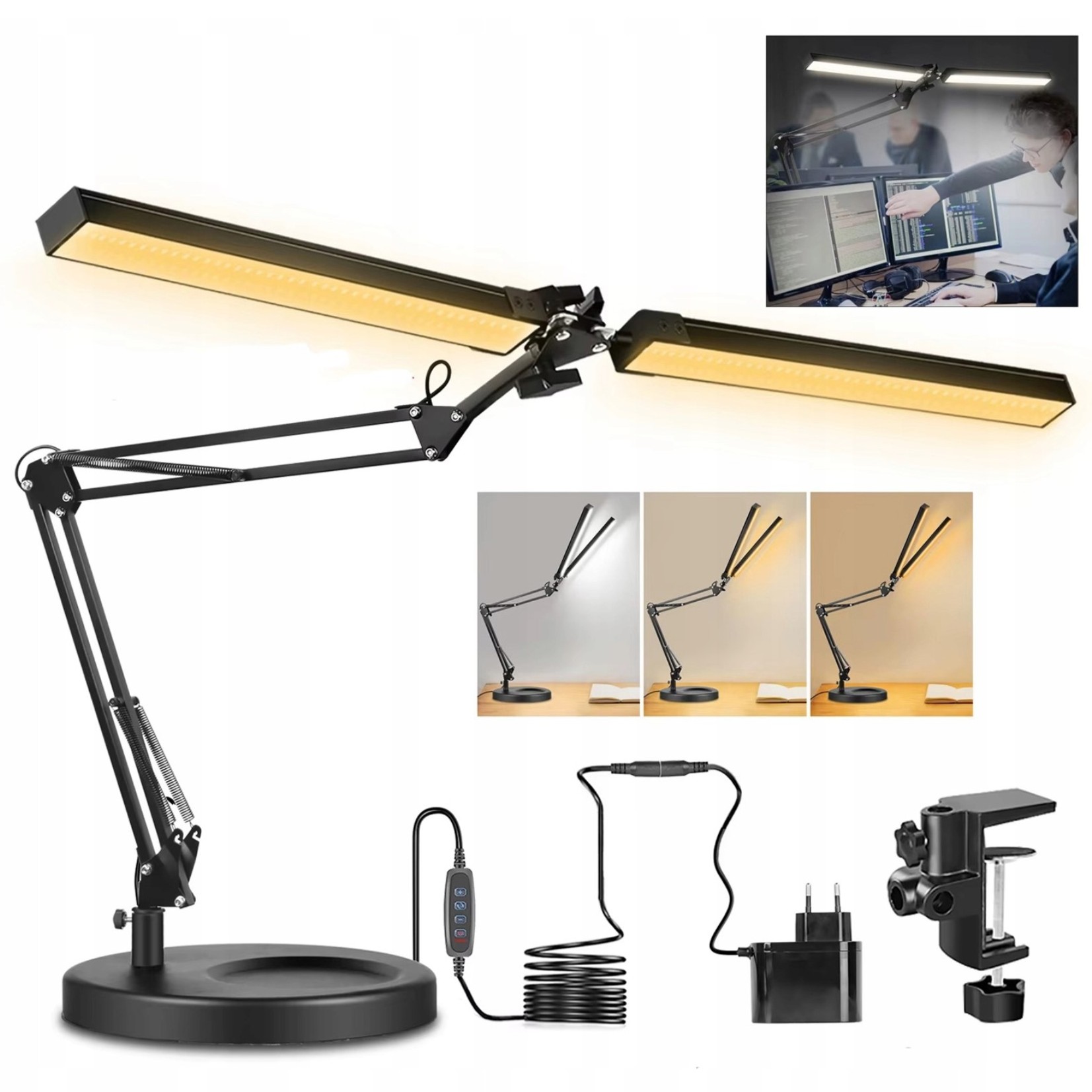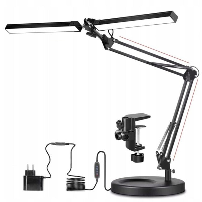Lampa de birou LED, Zola, 14W, 2 surse iluminare cu brate oscilante, reglabila 180°, 3 moduri iluminare, picior si suport de fixare pe blat, neagra