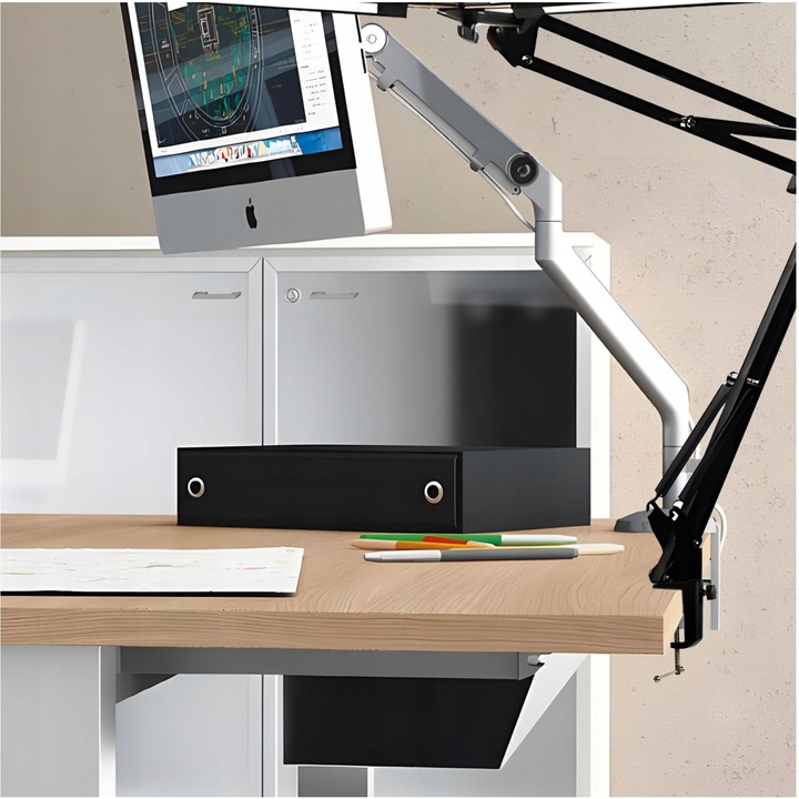 prin prinderea cu clema de fixare pe marginea mesei, economisind spatiu pe birou