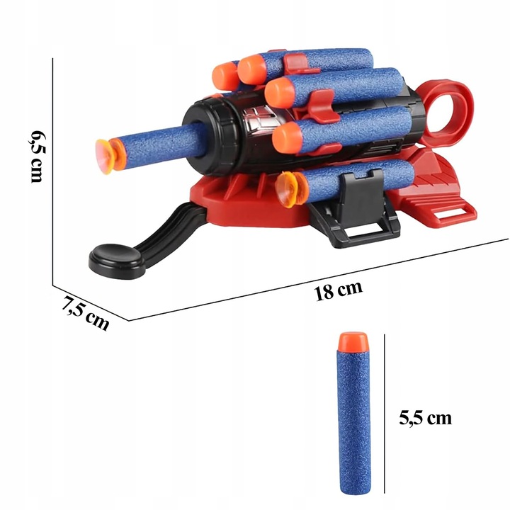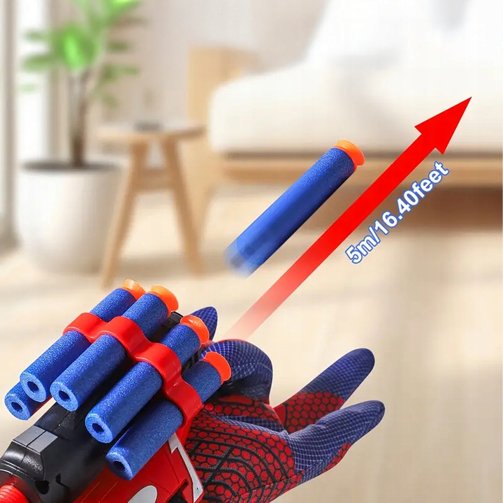 Manusa este echipata cu un lansator incorporat, care permite tragerea proiectilelor din burete, imitand perfect efectul unei panze de paianjen. Lansatorul este usor de folosit chiar si de catre cei mici, datorita mecanismului simplu de actionare. Copilul trebuie doar sa fixeze proiectilul, sa apese pe mecanism si sa se bucure de un joc interactiv plin de adrenalina. Setul include 20 de proiectile moi din burete, astfel incat distractia sa fie de lunga durata si sa nu existe riscul de accidentare.
