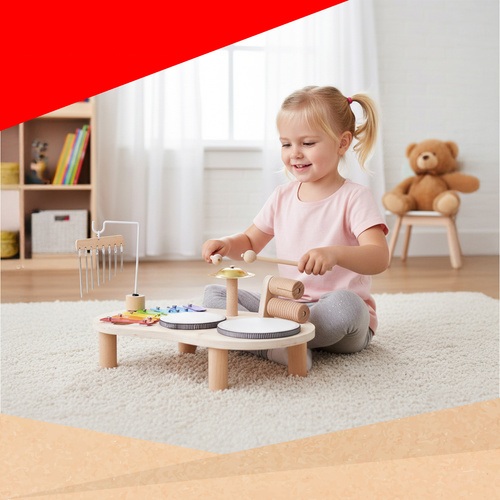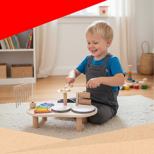 Dezvolta abilitati muzicale si ritmice – copilul invata sa recunoasca sunetele xilofonului, tobelor si clopoteilor, dezvoltandu-si simtul auditiv si ritmul natural. Joaca frecventa cu aceste instrumente stimuleaza limbajul, memoria si concentrarea.