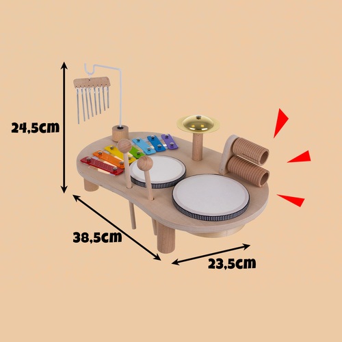 Jucarie multifunctionala – combina mai multe instrumente intr-un singur set (xilofon, tobe, cimbale, clopotei si zornaitoare), oferind multiple moduri de joaca si invatare.