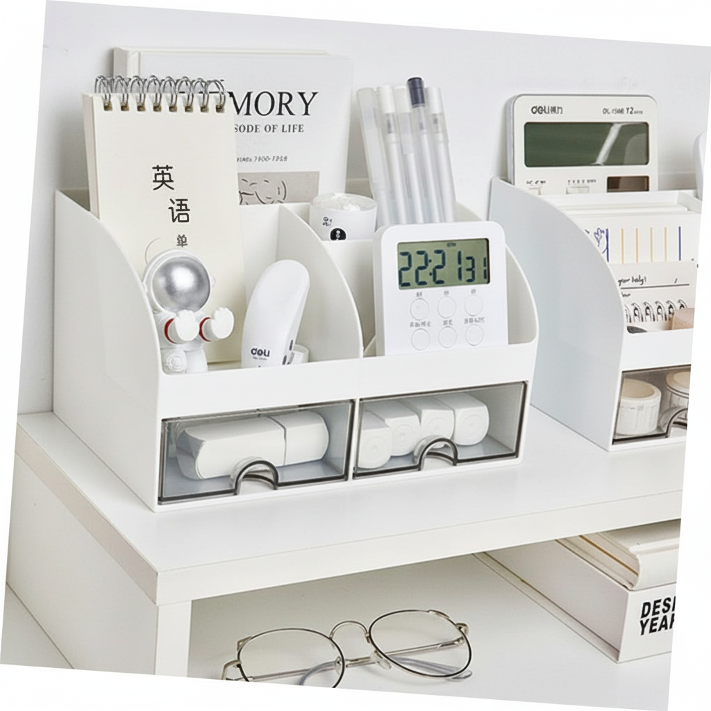 Organizatorul de birou cu 2 sertare si 6 compartimente este o soluie practica si eleganta pentru orice spatiu in care ai nevoie de ordine rapida. Designul sau compact si modern permite depozitarea eficienta a obiectelor mici, fara a ocupa mult loc pe birou, iar aspectul alb/transparent il face usor de integrat atat intr-un birou profesional, cat si intr-o camera pentru copii sau intr-un colt dedicat ingrijirii personale. Este un accesoriu versatil, simplu de folosit, dar extrem de util pentru a mentine totul la indemana.