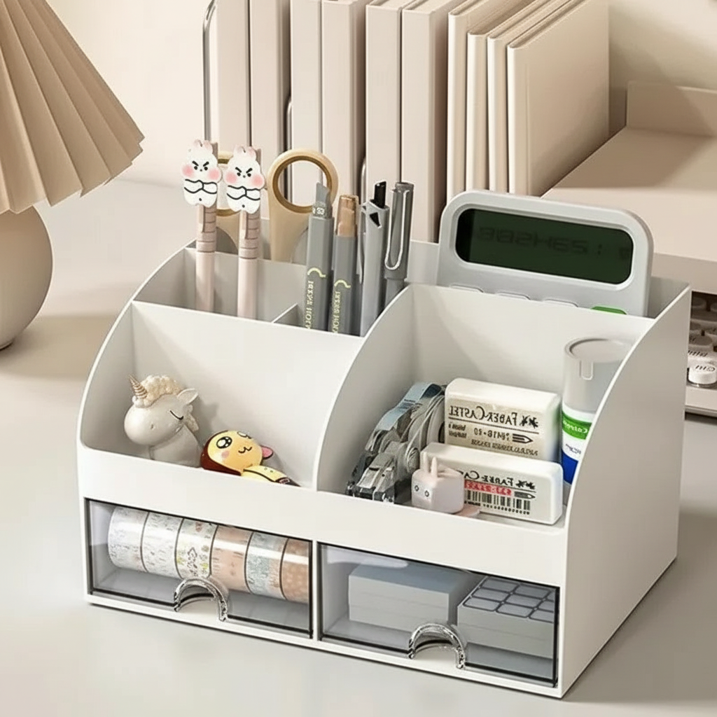 Organizatorul ofera versatilitate ridicata, fiind potrivit pentru rechizite scolare, cosmetice, accesorii mici, instrumente de scris si articole de papetarie. Cele 6 compartimente sunt concepute astfel incat sa poti aseza totul organizat: pixuri, creioane, notite, rigle, pensule de machiaj, rimel, rujuri sau agrafe. In plus, cele 2 sertare transparente permit depozitarea obiectelor sensibile sau mici, pe care vrei sa le pastrezi ferite de praf, dar vizibile pentru acces rapid. Acest organizator este o alegere excelenta pentru birou, camera unui student, masa de toaleta sau chiar pentru baie, oferind o solutie completa pentru ordinea zilnica.