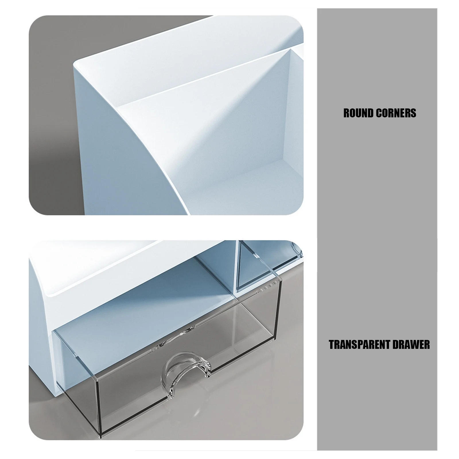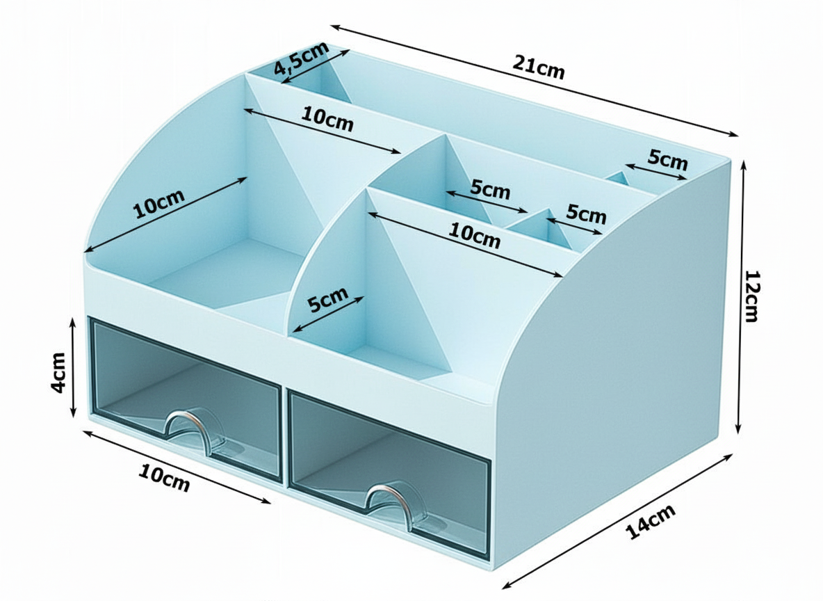 Organizatorul de birou cu 2 sertare si 6 compartimente este o soluie practica si eleganta pentru orice spatiu in care ai nevoie de ordine rapida. Designul sau compact si modern permite depozitarea eficienta a obiectelor mici, fara a ocupa mult loc pe birou, iar aspectul bleu/transparent il face usor de integrat atat intr-un birou profesional, cat si intr-o camera pentru copii sau intr-un colt dedicat ingrijirii personale. Este un accesoriu versatil, simplu de folosit, dar extrem de util pentru a mentine totul la indemana.