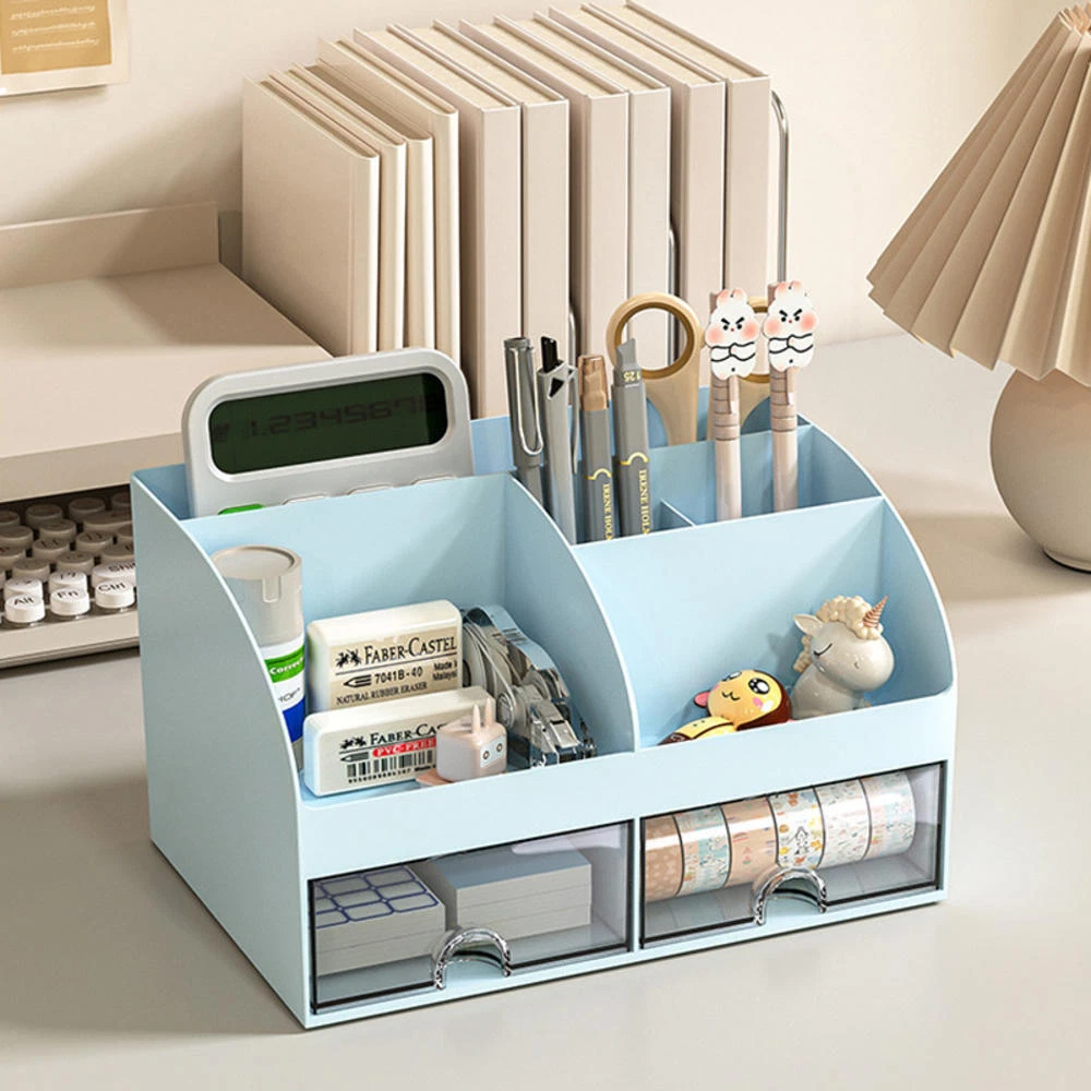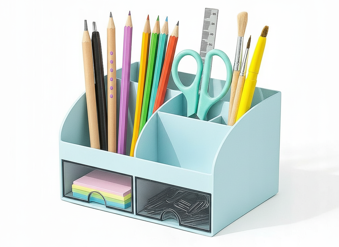 Organizatorul ofera versatilitate ridicata, fiind potrivit pentru rechizite scolare, cosmetice, accesorii mici, instrumente de scris si articole de papetarie. Cele 6 compartimente sunt concepute astfel incat sa poti aseza totul organizat: pixuri, creioane, notite, rigle, pensule de machiaj, rimel, rujuri sau agrafe. In plus, cele 2 sertare transparente permit depozitarea obiectelor sensibile sau mici, pe care vrei sa le pastrezi ferite de praf, dar vizibile pentru acces rapid. Acest organizator este o alegere excelenta pentru birou, camera unui student, masa de toaleta sau chiar pentru baie, oferind o solutie completa pentru ordinea zilnica.