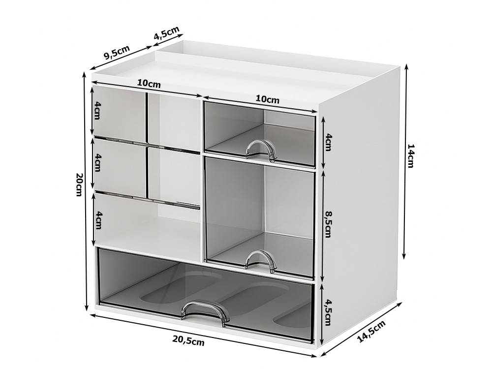 Organizatorul de birou cu 3 sertare si 5 compartimente este alegerea potrivita pentru oricine doreste mai multa ordine, functionalitate si un aspect curat pe birou, masa de toaleta sau in camera de studiu. Construit din plastic rezistent, cu un design modern alb/transparent, acest accesoriu ajuta la organizarea eficienta a tuturor obiectelor mici, astfel incat sa fie mereu la indemana si usor de gasit.