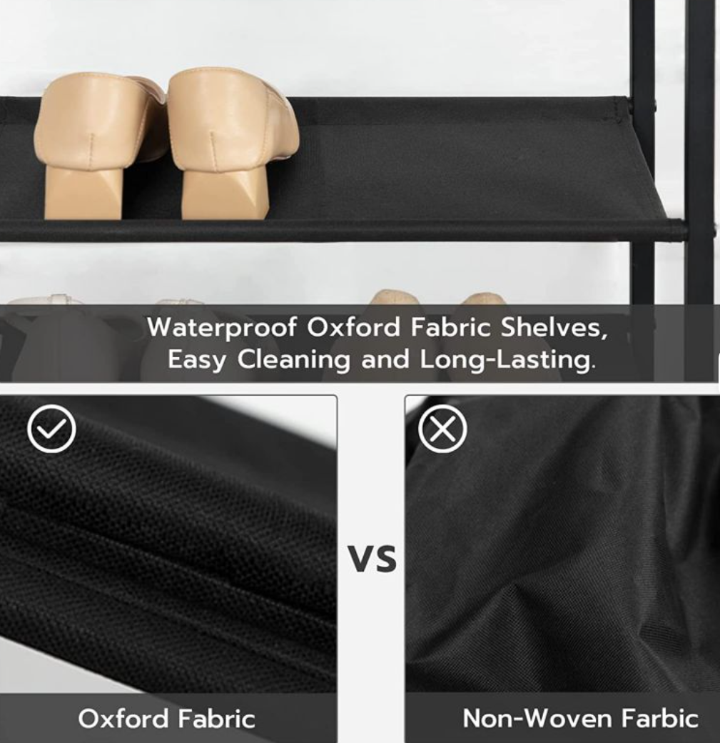 Constructia sa este realizata din metal, plastic si material textil, o combinatie practica ce ofera un echilibru bun intre rezistenta, greutate redusa si montaj usor. Cadrul metalic contribuie la stabilitate, elementele din plastic faciliteaza imbinarea componentelor, iar rafturile textile sunt potrivite pentru sustinerea incaltamintei usoare si medii. Acest lucru face ca produsul sa fie usor de mutat, simplu de montat si convenabil pentru utilizare zilnica.