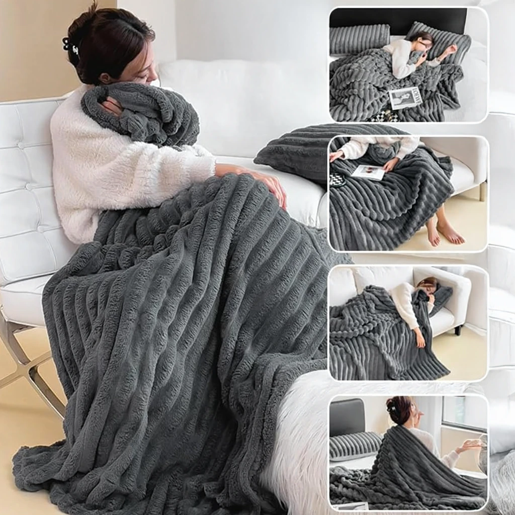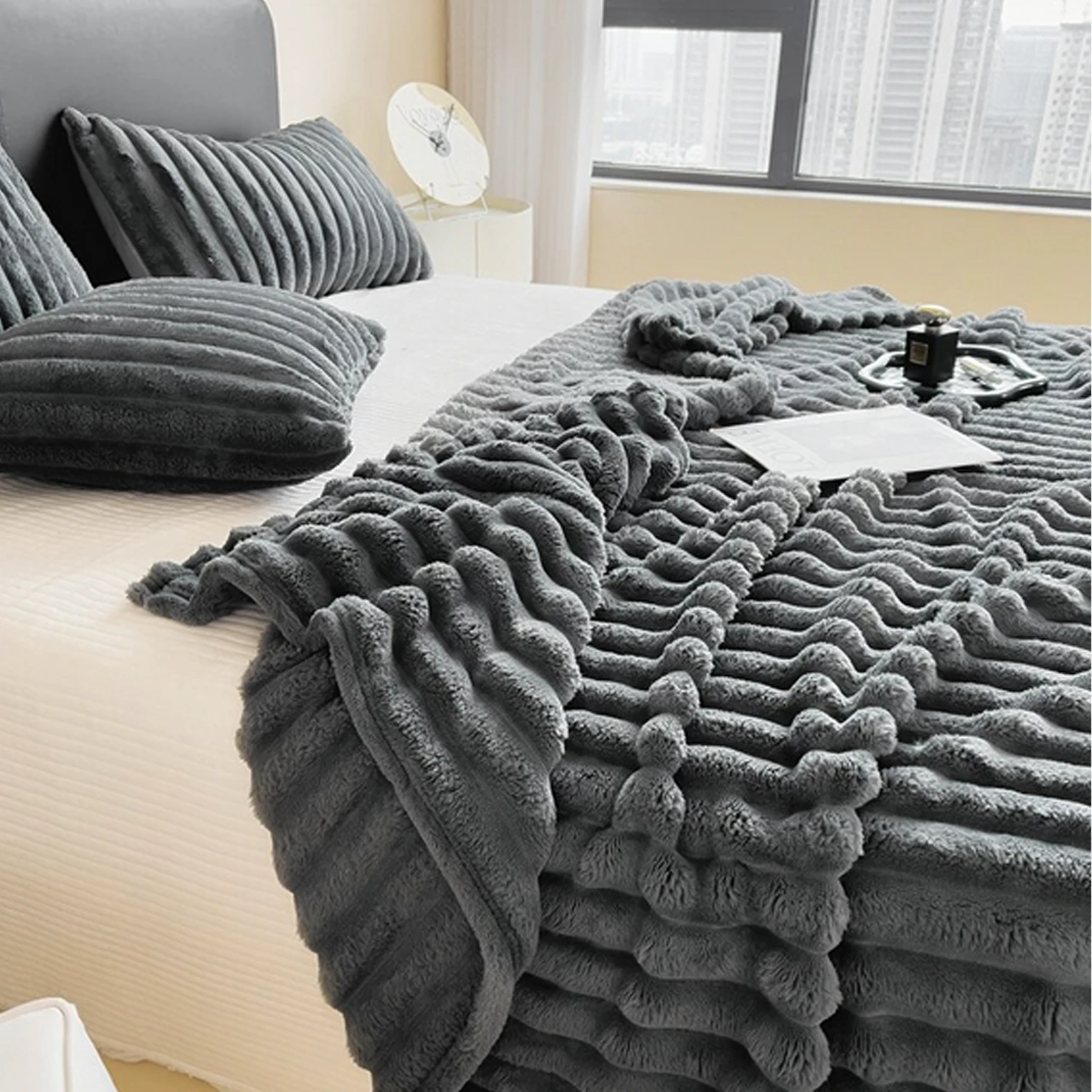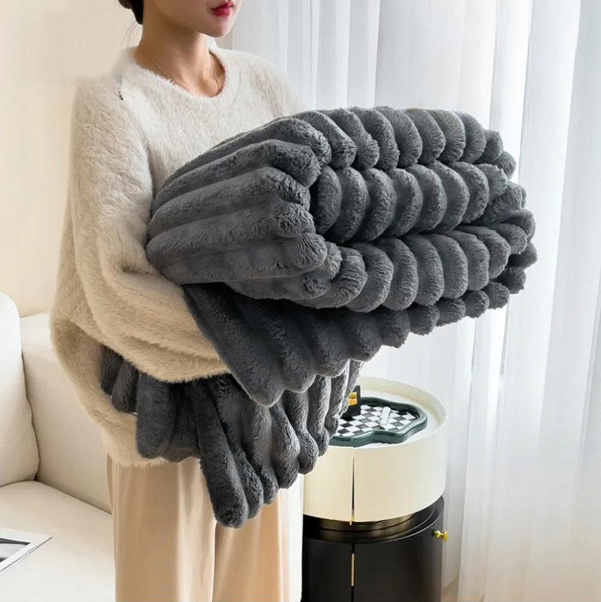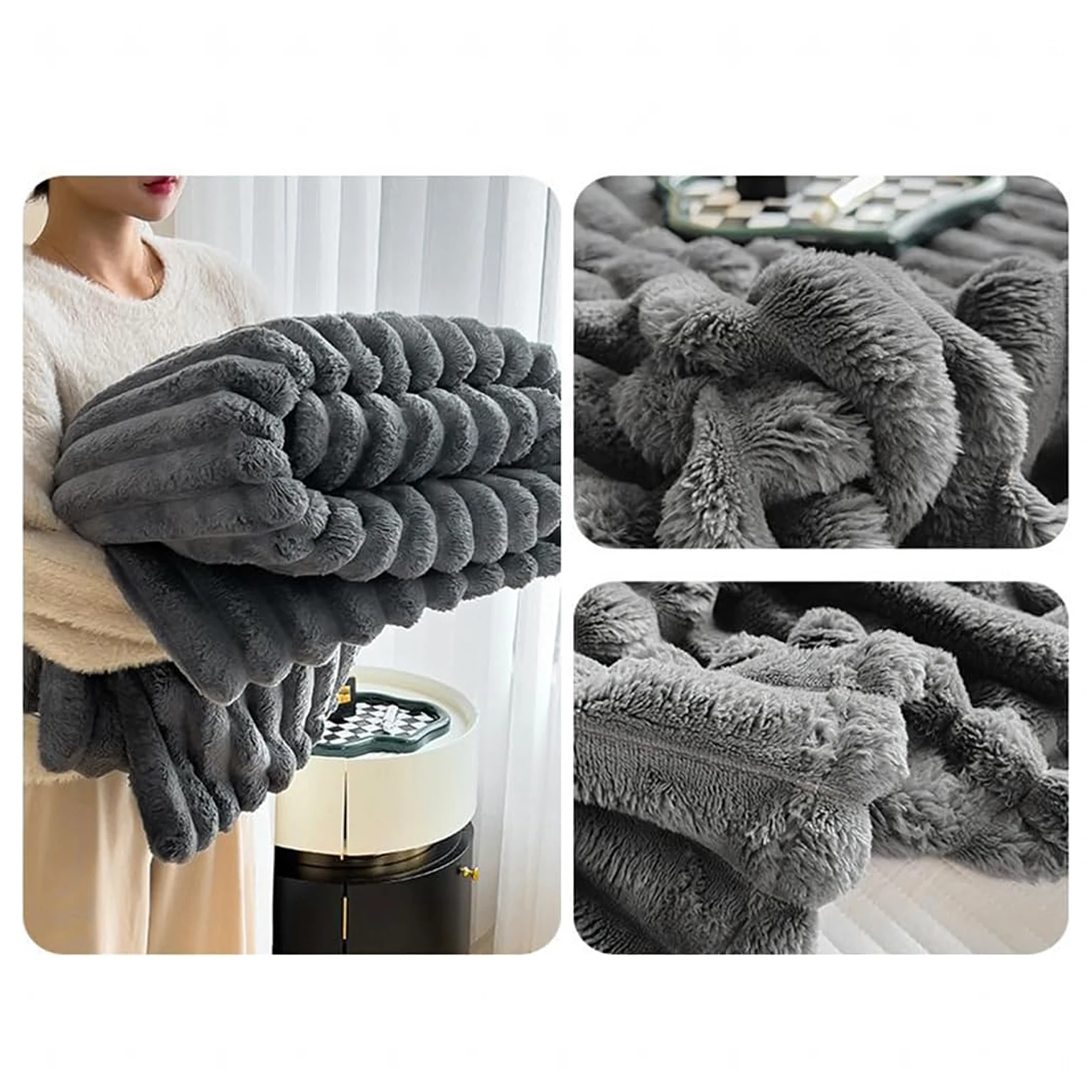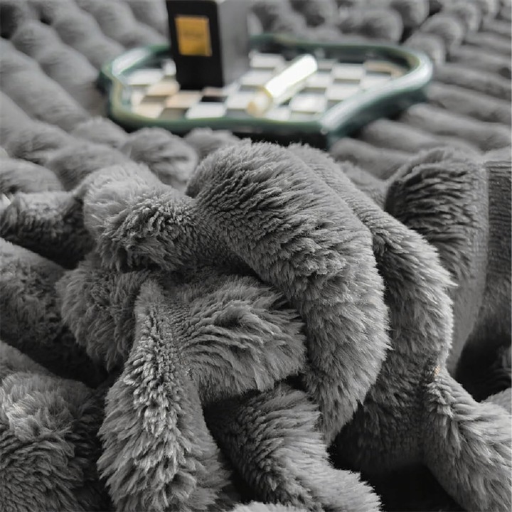 Patura moale si pufoasa, Zola, 200 x 220 cm, model dungi in relief, microfibra, gri inchis