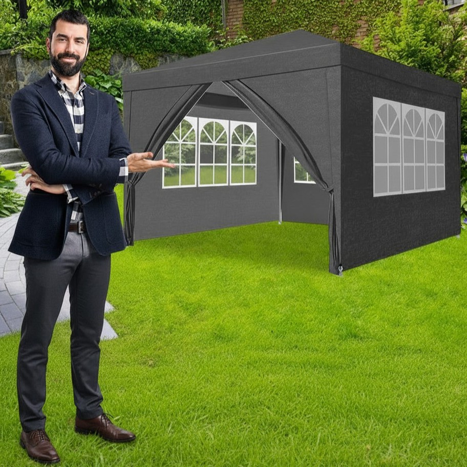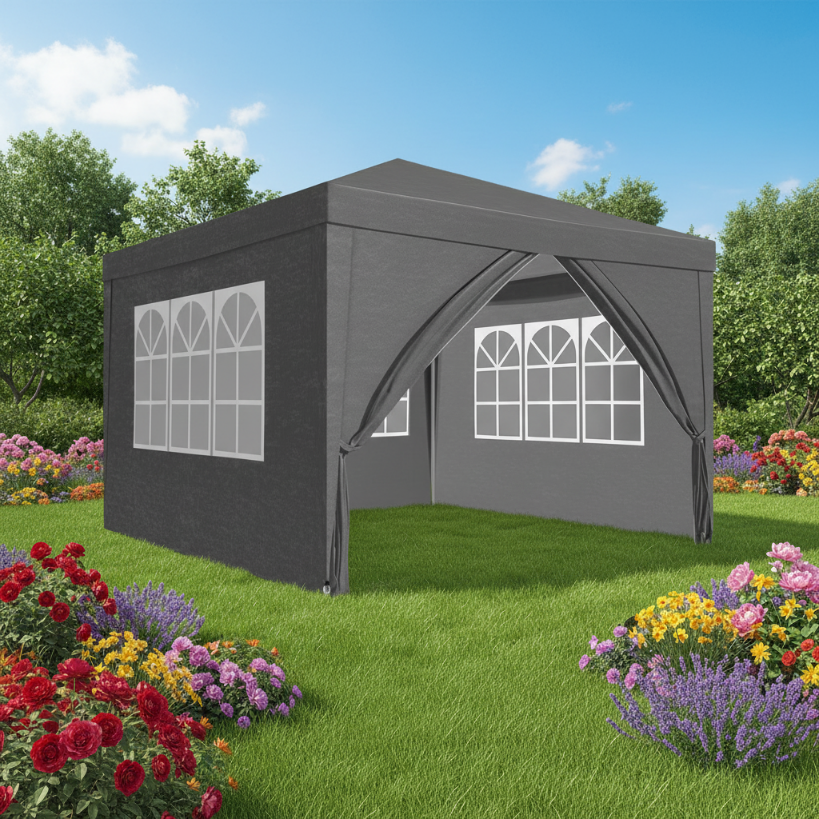 Pavilionul de gradina cu pereti detasabili este o solutie practica si versatila pentru amenajarea unui spatiu acoperit in curte, gradina, terasa sau la diverse evenimente organizate in aer liber. Datorita structurii stabile din otel si invelisului din polietilena impermeabila, acest pavilion ofera protectie impotriva soarelui, vantului usor si precipitatiilor usoare, contribuind la un plus de confort in timpul utilizarii.